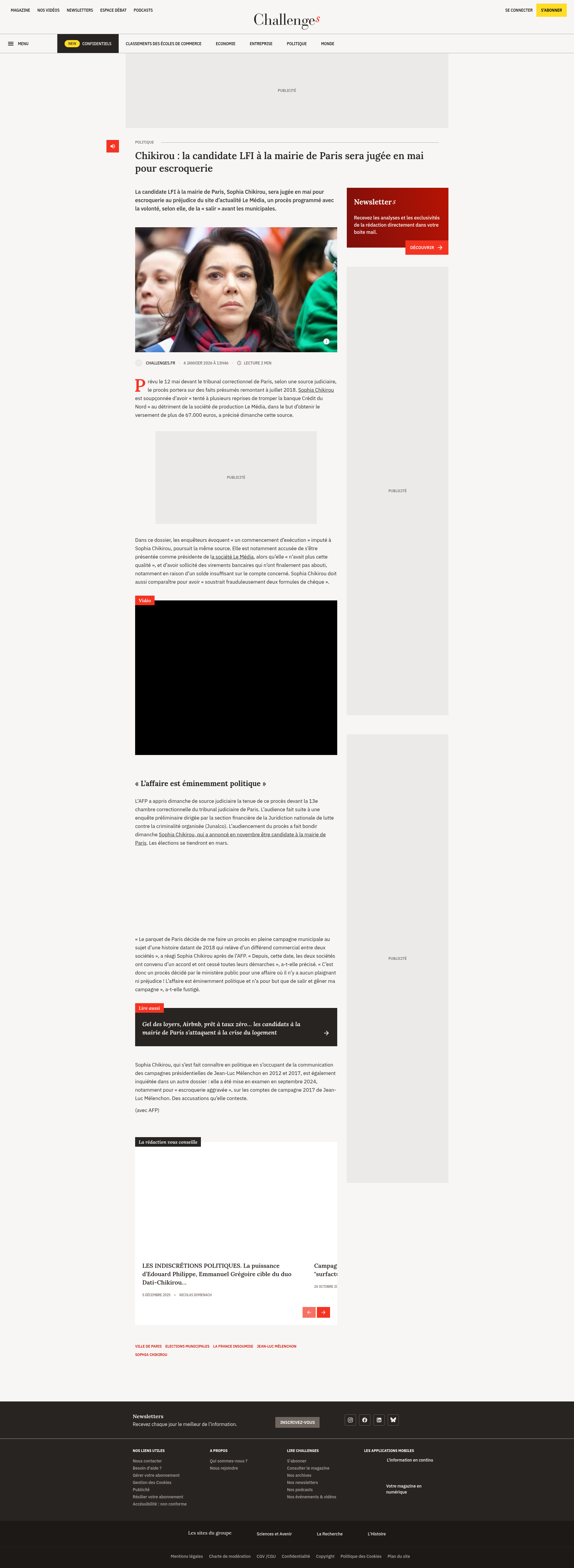 La candidate LFI à la mairie de Paris, Sophia Chikirou, sera jugée en mai pour escroquerie au préjudice du site d'actualité Le Média, un procès programmé avec la volonté, selon elle, de la "salir" avant les municipales.La candidate LFI à la mairie de Paris, Sophia Chikirou, sera jugée en mai pour escroquerie au préjudice du site d’actualité Le Média, un procès programmé avec la volonté, selon elle, de la « salir » avant les municipales.PNGPDF