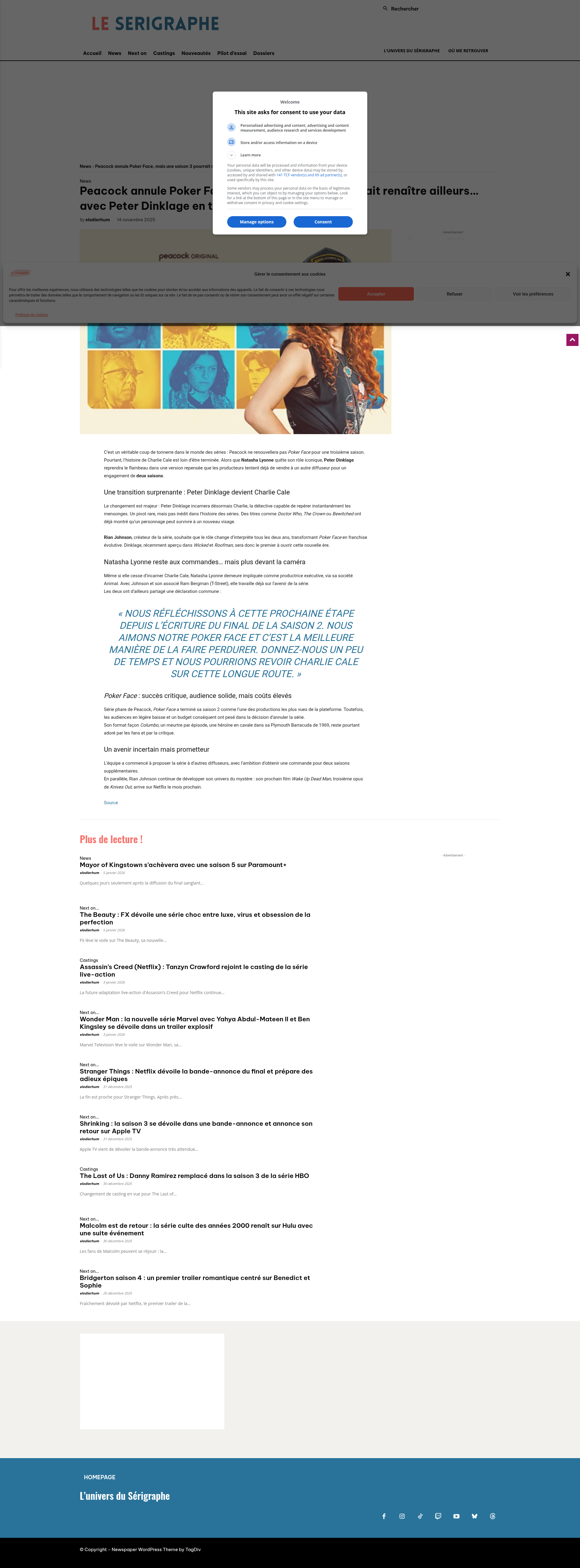Peacock annule Poker Face, mais une saison 3 pourrait renaître ailleurs… avec Peter Dinklage en tête d’affiche | Le Sérigraphe.Peacock annule Poker Face, mais Rian Johnson relance la série ailleurs avec Peter Dinklage dans le rôle principal. Natasha Lyonne reste productrice exécutive. Tous les détails sur la future saison 3.PNGPDF