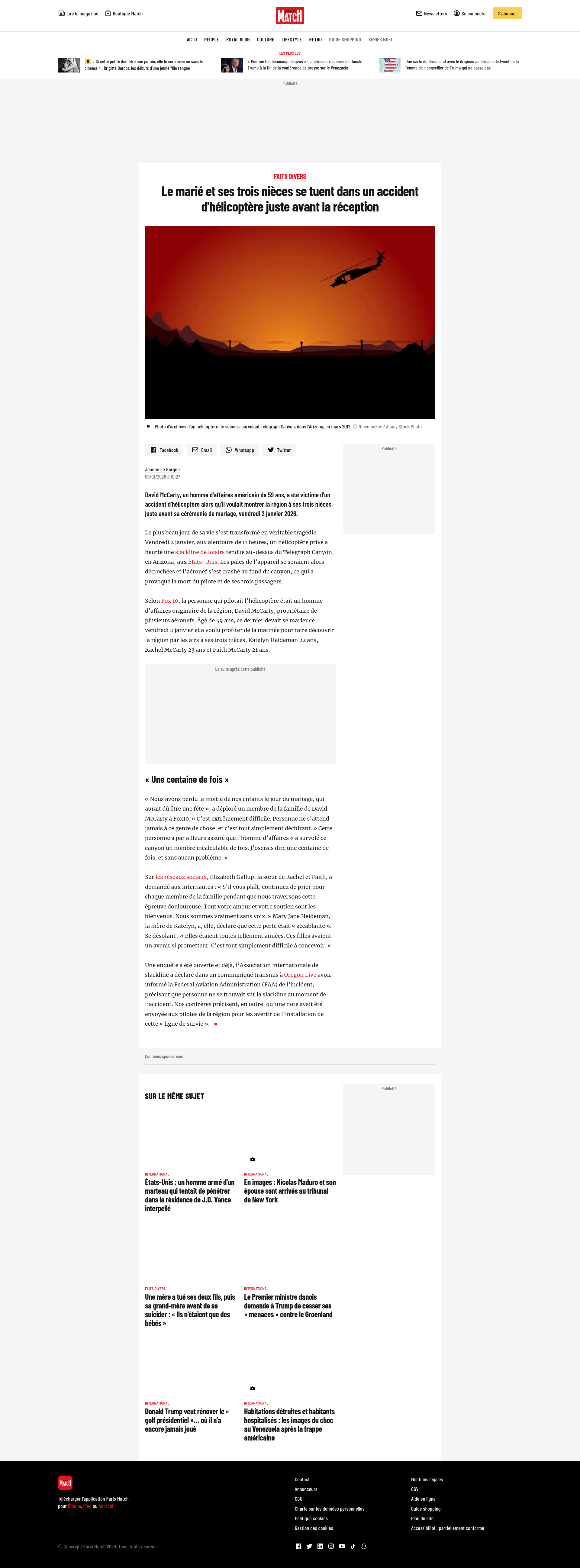 Le marié et ses trois nièces se tuent dans un accident d'hélicoptère juste avant la réceptionDavid McCarty, un homme d'affaires américain de 59 ans, a été victime d'un accident d'hélicoptère alors qu'il voulait montrer la région à ses trois nièces, juste avant sa cérémonie de mariage, vendredi 2 janvier 2026.PNGPDF