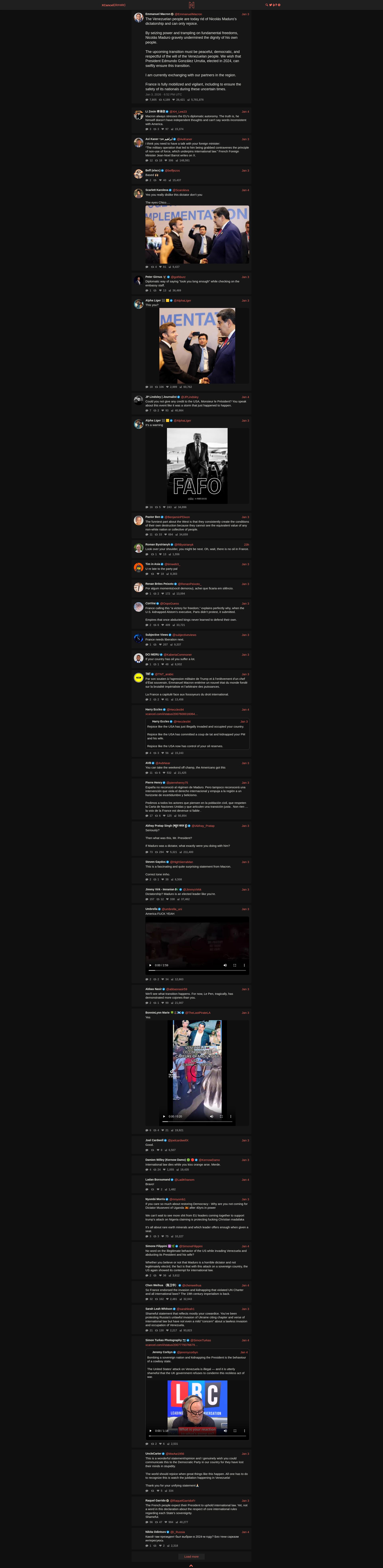 Emmanuel Macron (@EmmanuelMacron)The Venezuelan people are today rid of Nicolás Maduro’s dictatorship and can only rejoice. By seizing power and trampling on fundamental freedoms, Nicolás Maduro gravely undermined the dignity of his own people. The upcoming transition must be peaceful, democratic, and respectful of the will of the Venezuelan people. We wish that President Edmundo González Urrutia, elected in 2024, can swiftly ensure this transition. I am currently exchanging with our partners in the region. France is fully mobilized and vigilant, including to ensure the safety of its nationals during these uncertain times.PNGPDF
