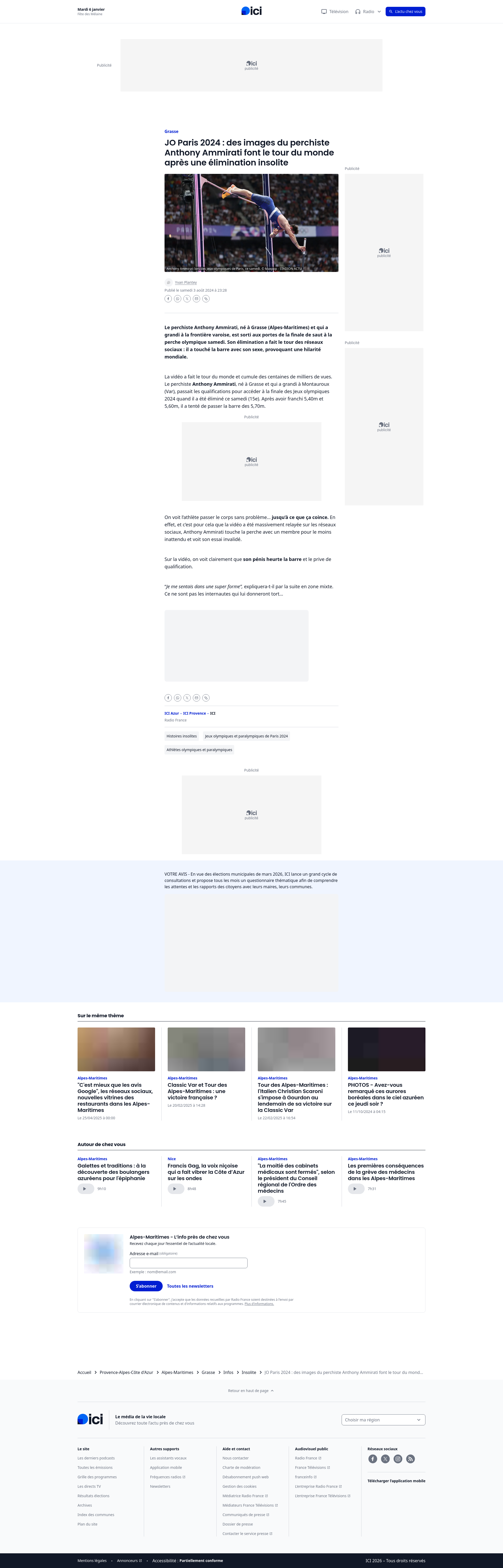 JO Paris 2024 : des images du perchiste Anthony Ammirati font le tour du monde après une élimination insolite - ICILe perchiste Anthony Ammirati, né à Grasse (Alpes-Maritimes) et qui a grandi à la frontière varoise, est sorti aux portes de la finale de saut à la perche olympique samedi. Son élimination a fait le tour des réseaux sociaux : il a touché la barre avec son sexe, provoquant une hilarité mondiale.PNGPDF
