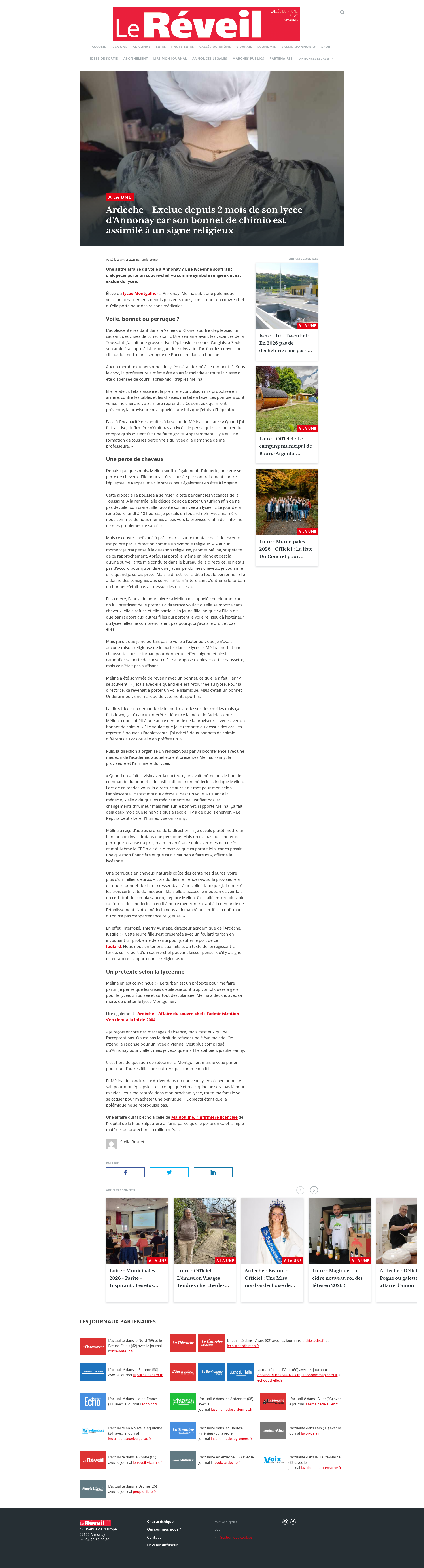 Ardèche - Annonay - Voile - Incroyable : exclue depuis 2 mois du lycée car son bonnet de chimio est assimilé à un signe religieuxUne autre affaire du voile à Annonay ? Une lycéenne souffrant d'alopécie porte un couvre-chef vu comme symbole religieux et est exclue du lycée.PNGPDF