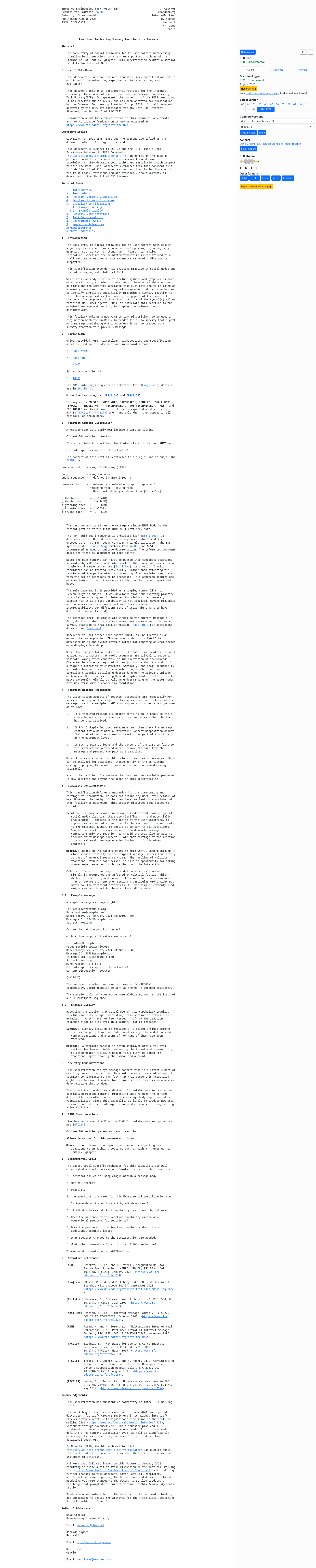RFC 9078: Reaction: Indicating Summary Reaction to a MessageThe popularity of social media has led to user comfort with easily signaling basic reactions to an author's posting, such as with a 'thumbs up' or 'smiley' graphic. This specification permits a similar facility for Internet Mail.PNGPDF