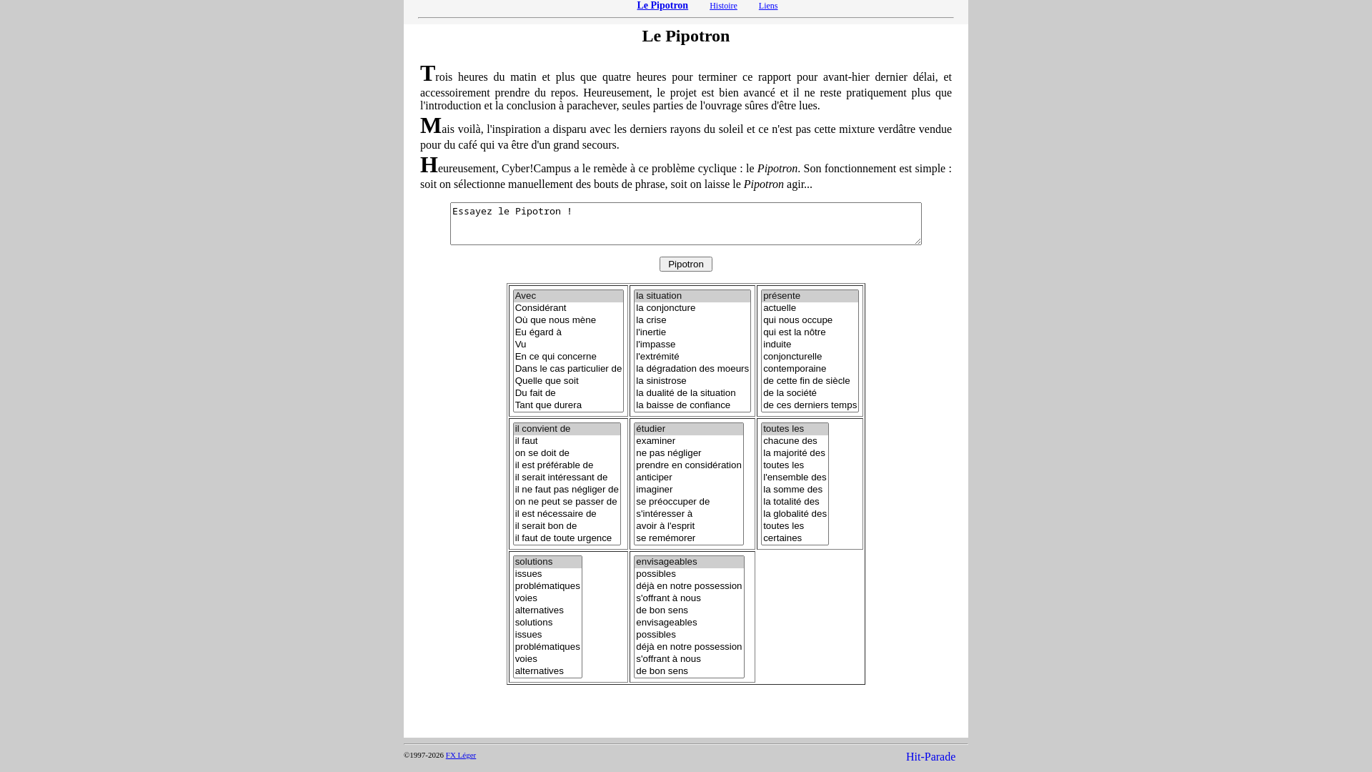 Le PipotronGénérateur automatique de phrases aléatoires – Phrases creuses, discours pipeau, fin de banquet, introduction ou conclusion de rapport, le Pipotron est l’outil indipensable. Fournisseur officiel de langue de boisPNGPDF