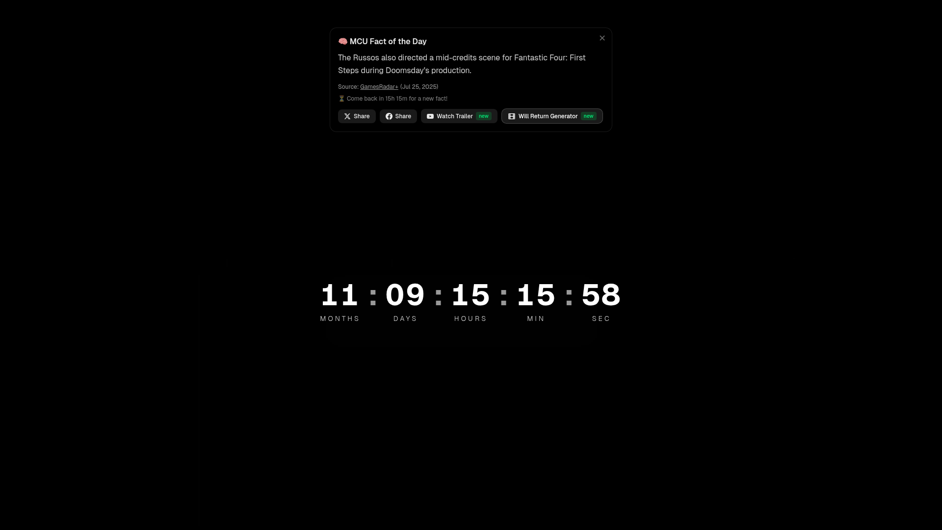 Avengers: Doomsday CountdownLive real-time countdown to Avengers: Doomsday - December 18, 2026 at 00:00 UTC. Track exactly how many days until Doctor Doom arrives!PNGPDF