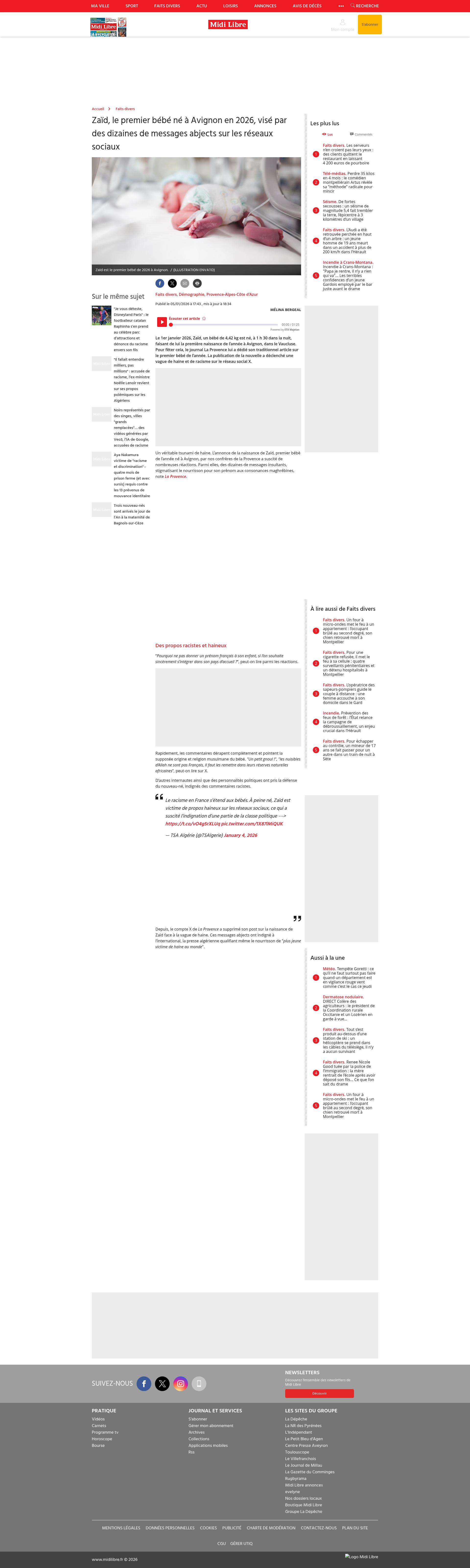 Zaïd, le premier bébé né à Avignon en 2026, visé par des dizaines de messages abjects sur les réseaux sociauxLe 1er janvier 2026, Zaïd, un bébé de 4,42 kg est né, à 1 h 30 dans la nuit, faisant de lui la première naissance de l’année à Avignon, dans le Vaucluse. Pour fêter cela, le journal La Provence lui a dédié son...PNGPDF