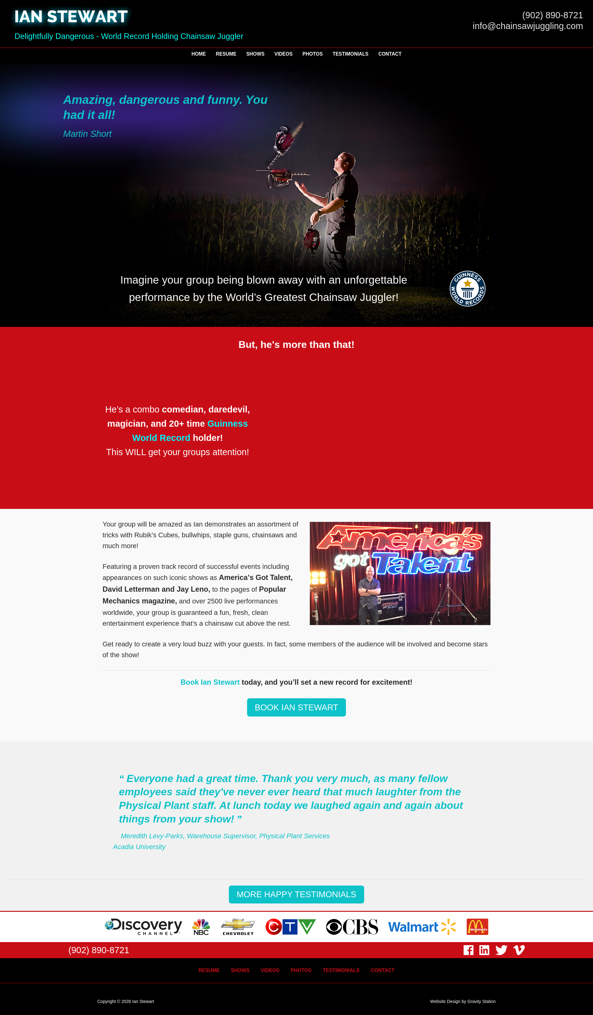 Home - Ian Stewart: Corporate Entertainment | Chainsaw JugglerIan Stewart the Top Chainsaw Juggler performs his delightfully dangerous comedy show at corporate events, colleges, and theatres worldwide.PNGPDF