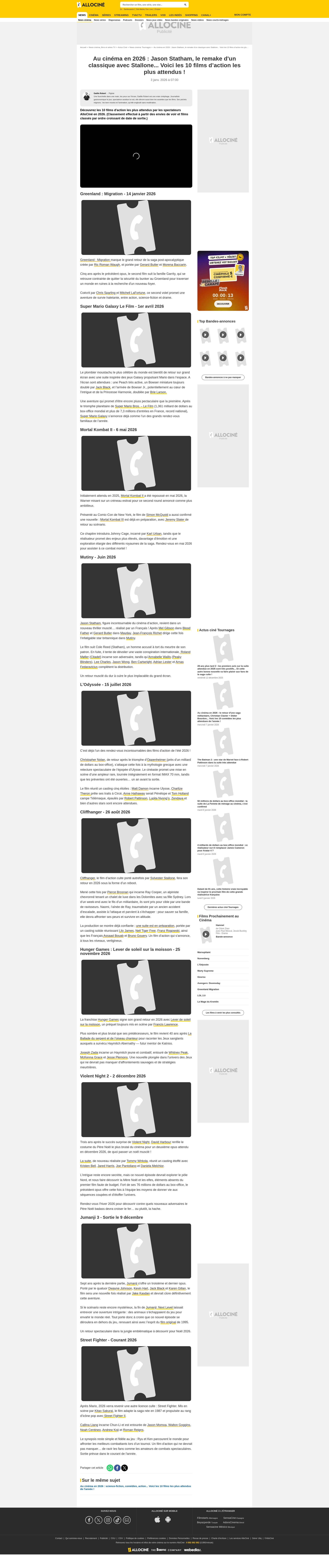 Au cinéma en 2026 : Jason Statham, le remake d'un classique avec Stallone... Voici les 10 films d’action les plus attendus !Découvrez les 10 films d'action les plus attendus par les spectateurs AlloCiné en 2026. (Classement effectué à partir des envies de voir et films classés par ordre croissant de date de sortie.)PNGPDF
