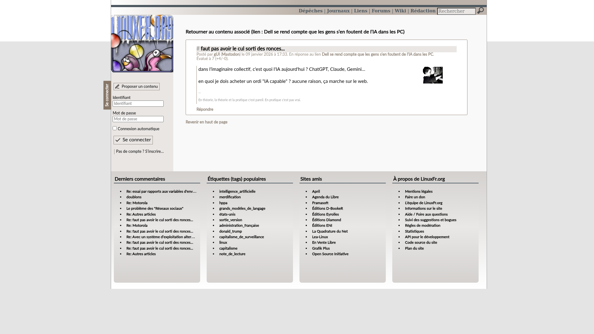 faut pas avoir le cul sorti des ronces... - LinuxFr.orgL’actualité du logiciel libre et des sujets voisins (DIY, Open Hardware, Open Data, les Communs, etc.), sur un site francophone contributif géré par une équipe bénévole par et pour des libristes enthousiastesPNGPDF