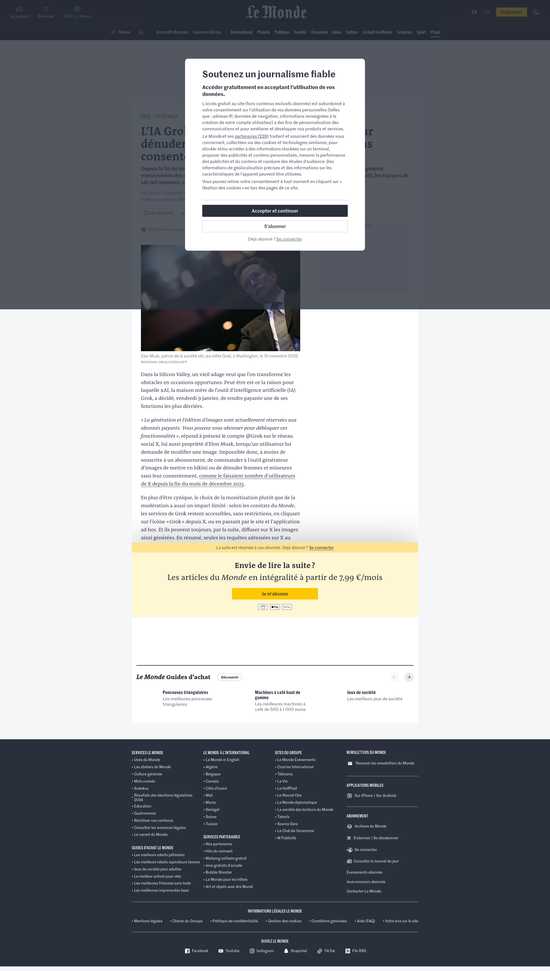 L’IA Grok propose désormais de payer pour dénuder les utilisateurs sur X, avec ou sans consentementDepuis la fin du mois de décembre 2025, l’intelligence artificielle d’Elon Musk est utilisée pour générer massivement des deepfakes à caractère sexuel. Face à l’indignation et aux appels à bloquer l’outil, les équipes de xAI ont annoncé, vendredi, un changement à la portée très limitée.PNGPDF