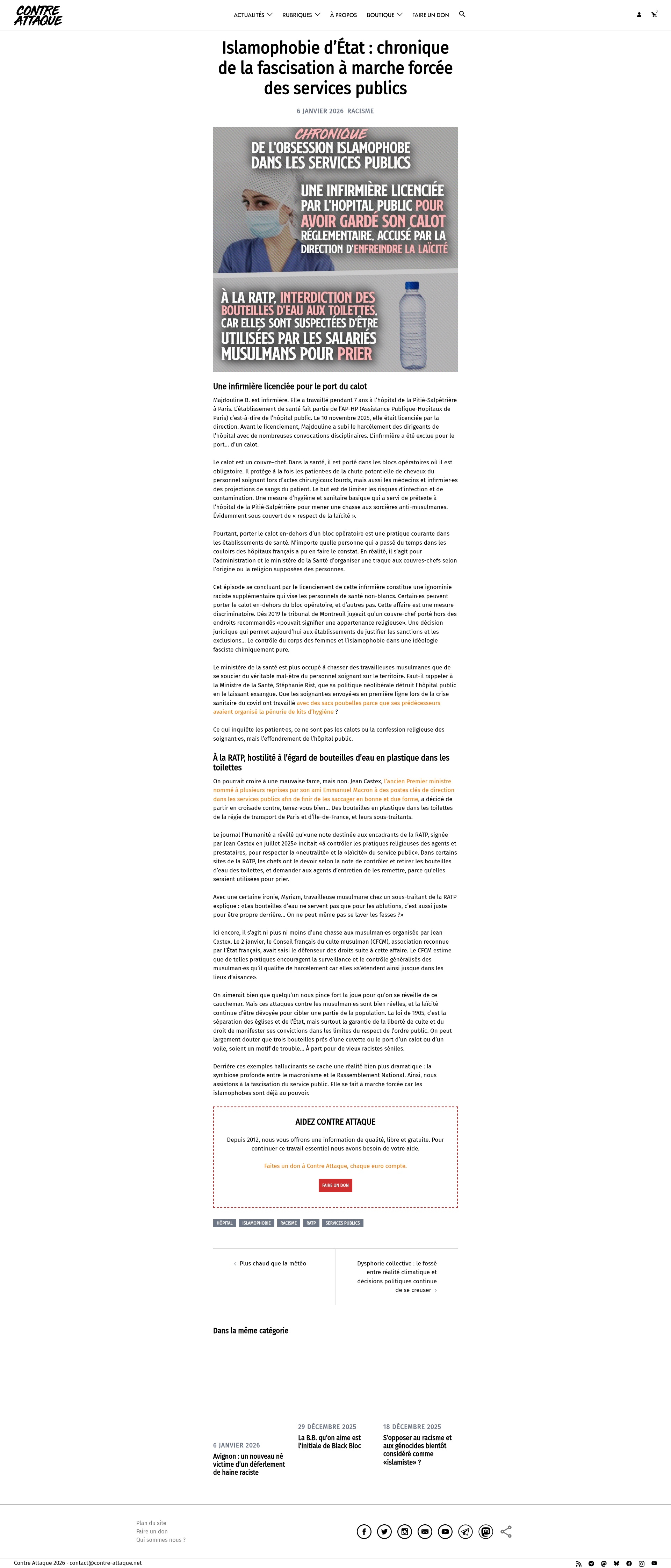Islamophobie d'État : chronique de la fascisation à marche forcée des services publicsDeux exemple récents de la fascisation à marche forcée des services publics, que ce soit à l'hôpital ou à la RATP.PNGPDF