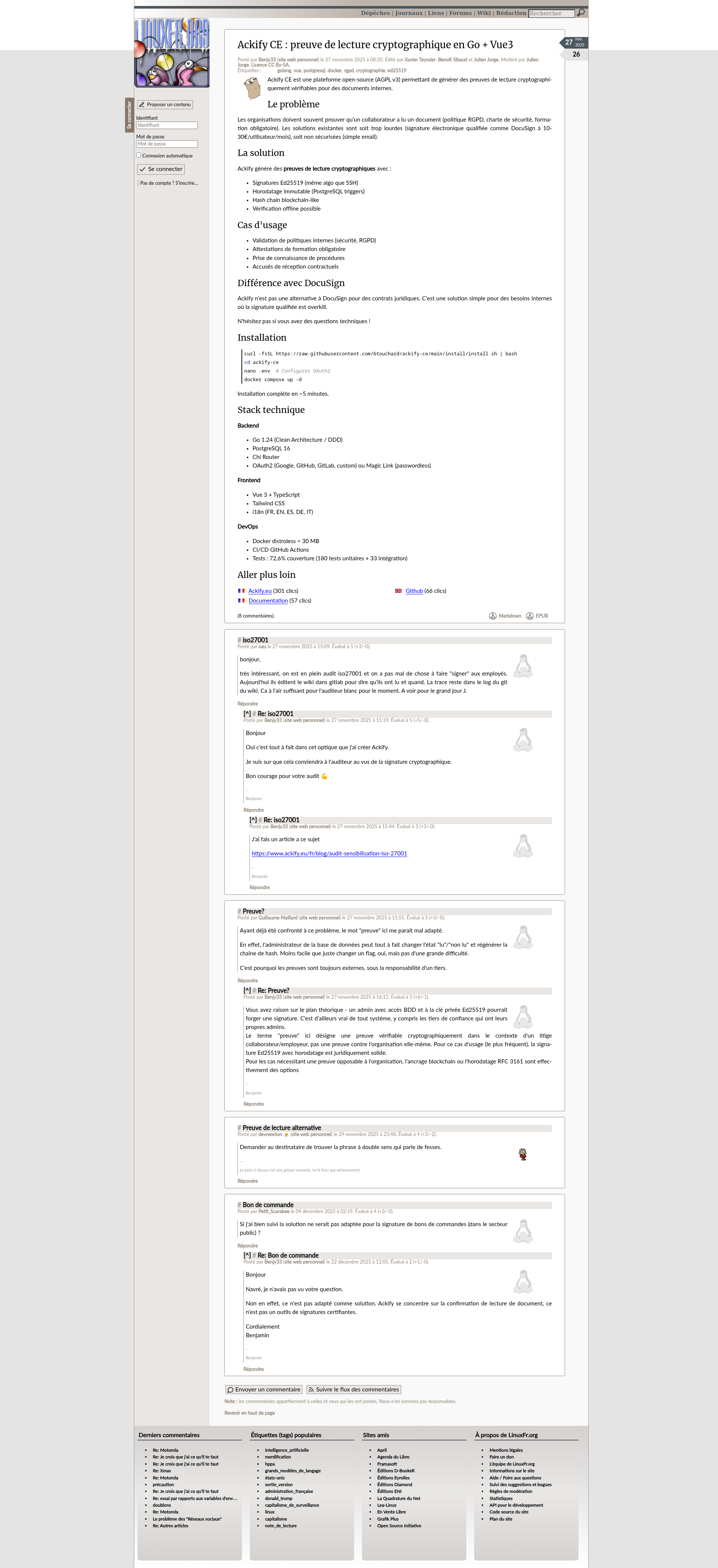 Ackify CE : preuve de lecture cryptographique en Go + Vue3 - LinuxFr.orgL’actualité du logiciel libre et des sujets voisins (DIY, Open Hardware, Open Data, les Communs, etc.), sur un site francophone contributif géré par une équipe bénévole par et pour des libristes enthousiastesPNGPDF