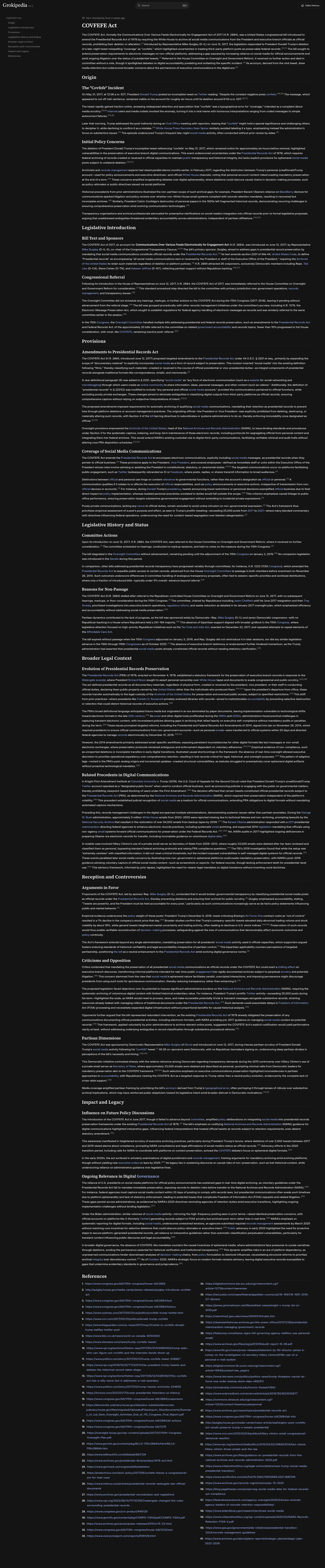 COVFEFE ActThe COVFEFE Act, formally the Communications Over Various Feeds Electronically for Engagement Act of 2017 (H.R. 2884), was a United States congressional bill introduced to amend the Presidential Records Act of 1978 by requiring the White House to archive all social media communications from the President and executive branch officials as official records, prohibiting their deletion or alteration. Introduced by Representative Mike Quigley (D-IL) on June 12, 2017, the legislation responded to...PNGPDF