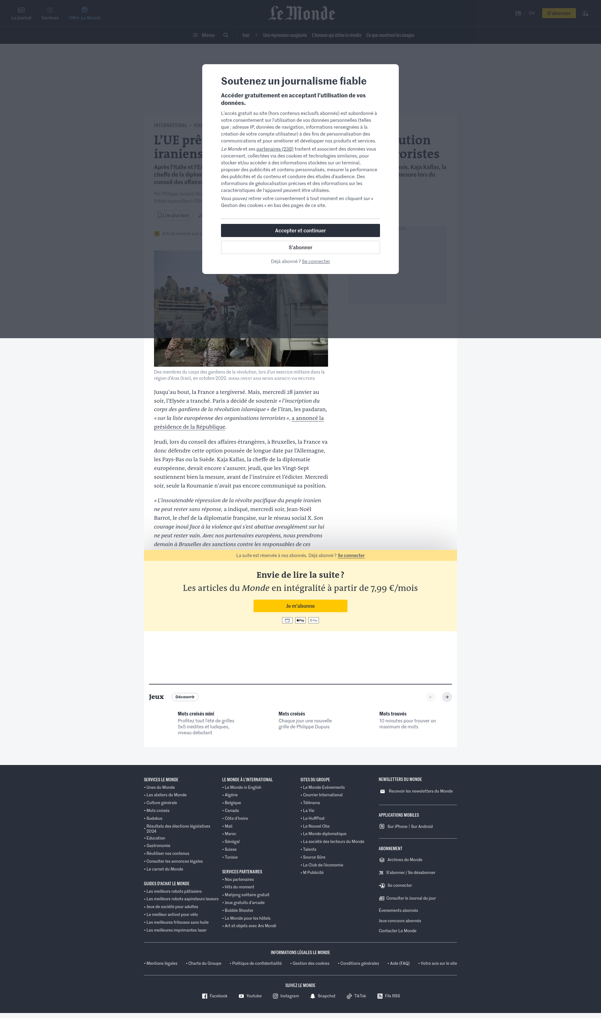 L’UE prête à placer les gardiens de la révolution iraniens sur la liste des organisations terroristesAprès l’Italie et l’Espagne, la France, qui s’opposait de longue date à cette mesure, a changé d’avis. Kaja Kallas, la cheffe de la diplomatie européenne, devait encore s’assurer que les Européens soutiennent la mesure lors du conseil des affaires étrangères, jeudi.PNGPDF