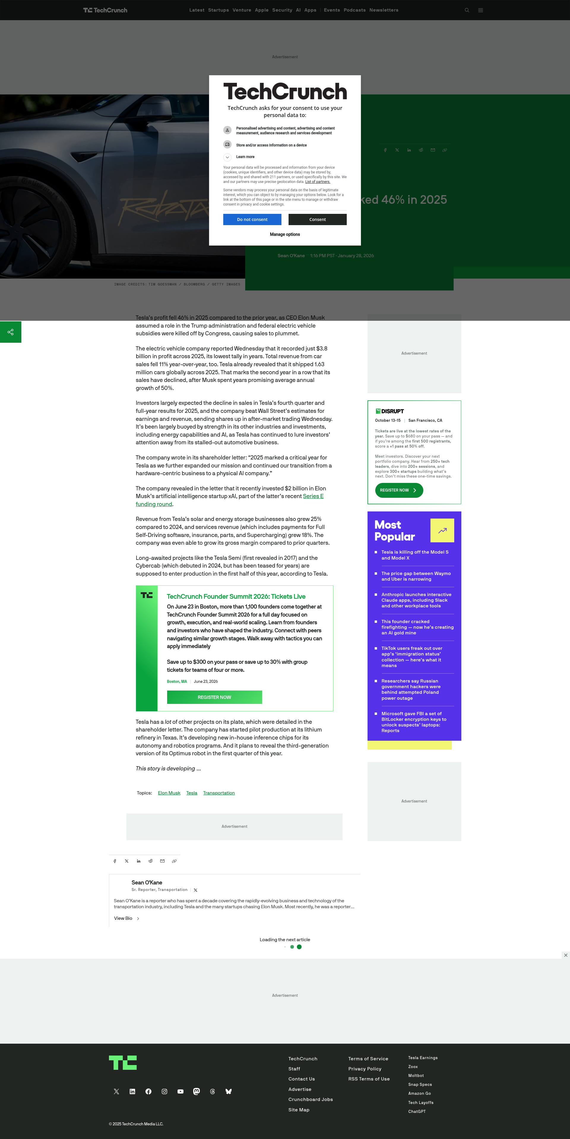 Tesla profit tanked 46% in 2025 | TechCrunchThe company's sales fell for a second year in a row, as Tesla looks to AI and robotics, including a new $2 billion investment in CEO Elon Musk's company xAI.PNGPDF