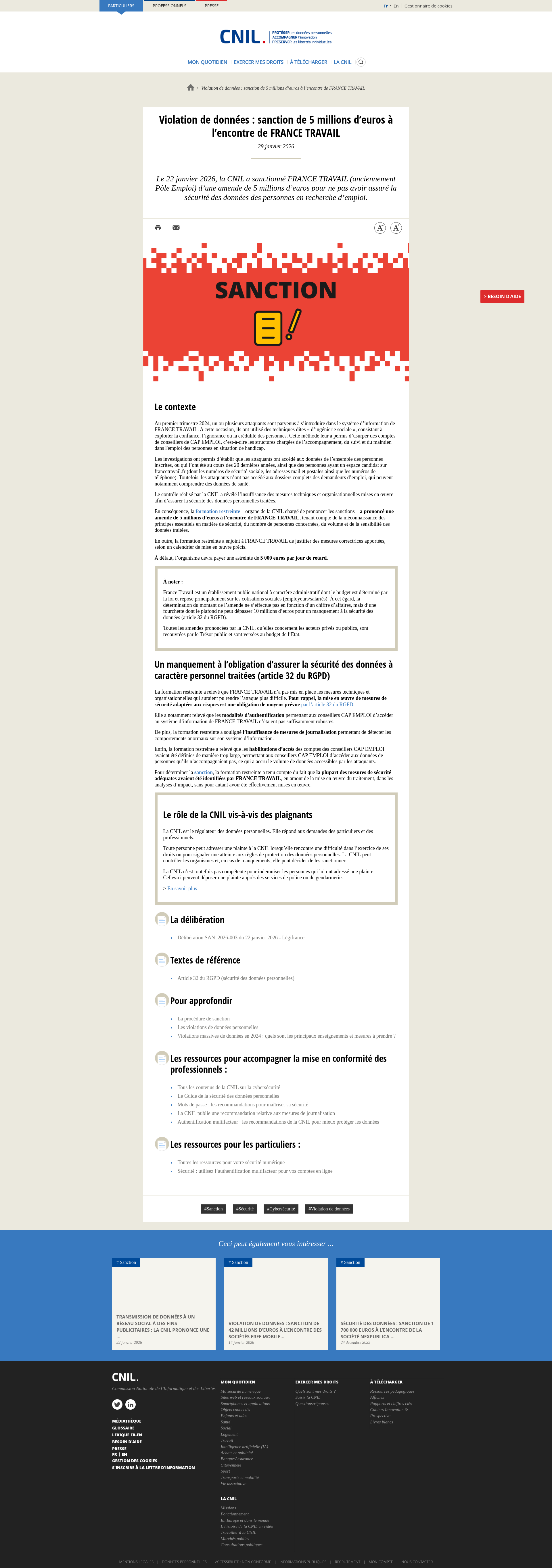 Violation de données : sanction de 5 millions d’euros à l’encontre de FRANCE TRAVAILLe contexte Au premier trimestre 2024, un ou plusieurs attaquants sont parvenus à s’introduire dans le système d’information de FRANCE TRAVAIL. A cette occasion, ils ont utilisé des techniques dites « d’ingénierie sociale », consistant à exploiter la confiance, l’ignorance ou la crédulité des personnes. Cette méthode leur a permis d’usurper des comptes de conseillers de CAP EMPLOI, c’est-à-dire les structures chargées de l’accompagnement, du suivi et du maintien dans l'emploi des personnes en situation de handicap.PNGPDF