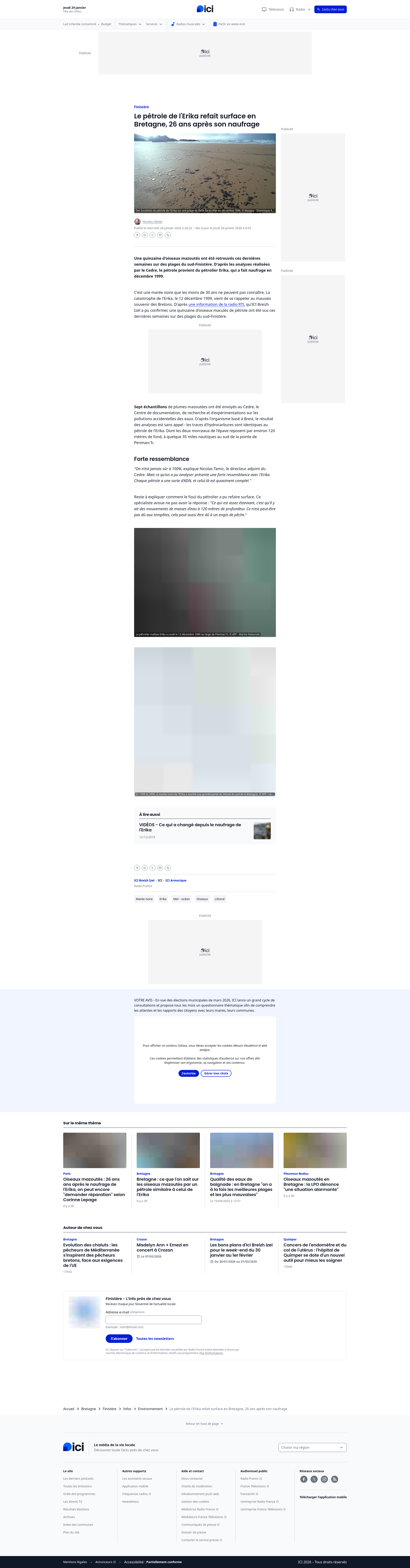 Le pétrole de l'Erika refait surface en Bretagne, 26 ans après son naufrage - ICIUne quinzaine d'oiseaux mazoutés ont été retrouvés ces dernières semaines sur des plages du sud-Finistère. D'après les analyses réalisées par le Cedre, le pétrole provient du pétrolier Erika, qui a fait naufrage en décembre 1999.PNGPDF