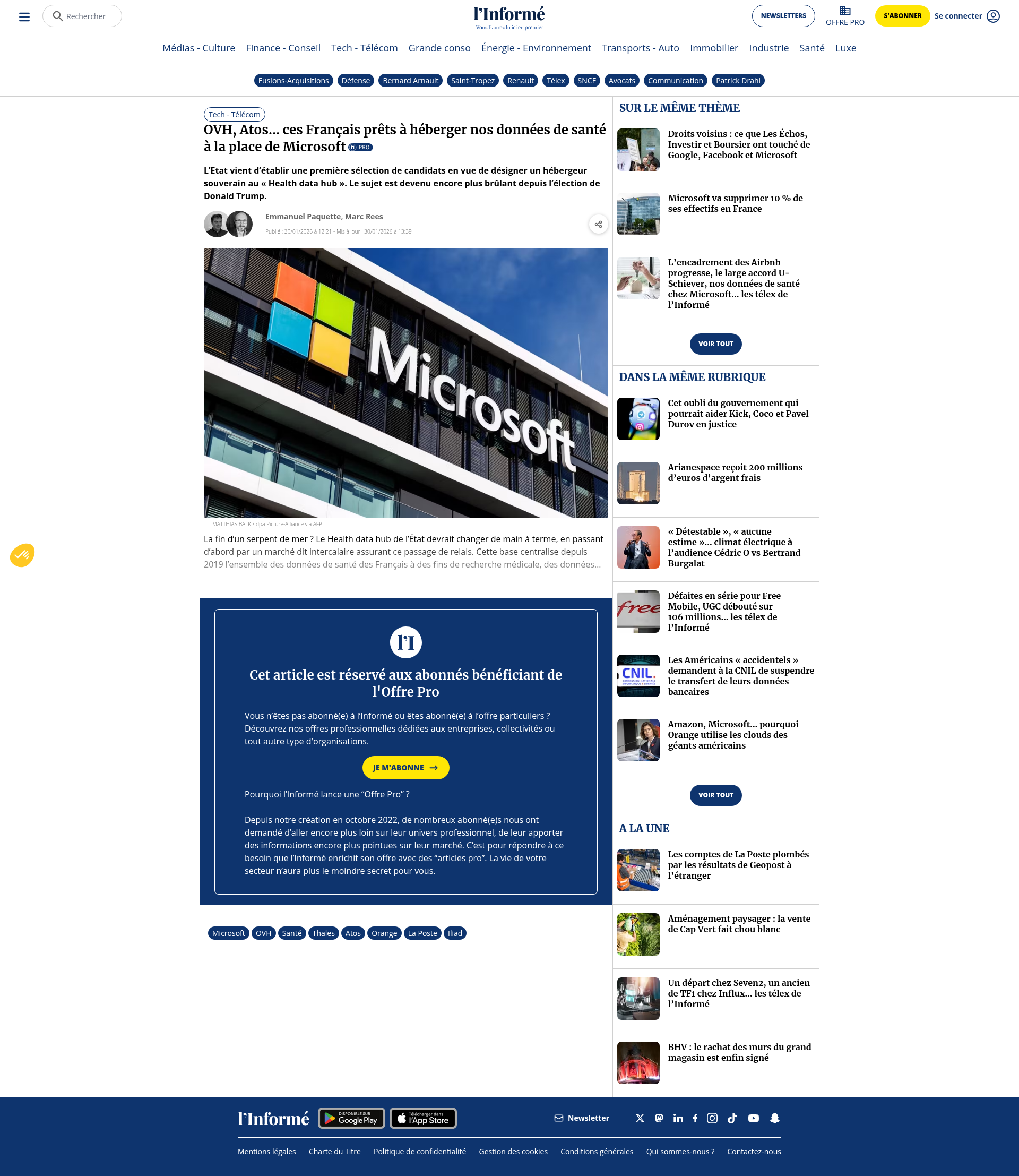 OVH, Atos… ces Français prêts à héberger nos données de santé à la place de MicrosoftL’Etat vient d’établir une première sélection de candidats en vue de désigner un hébergeur souverain au « Health data hub ». Le sujet est devenu encore plus brûlant depuis l’élection de Donald Trump.PNGPDF