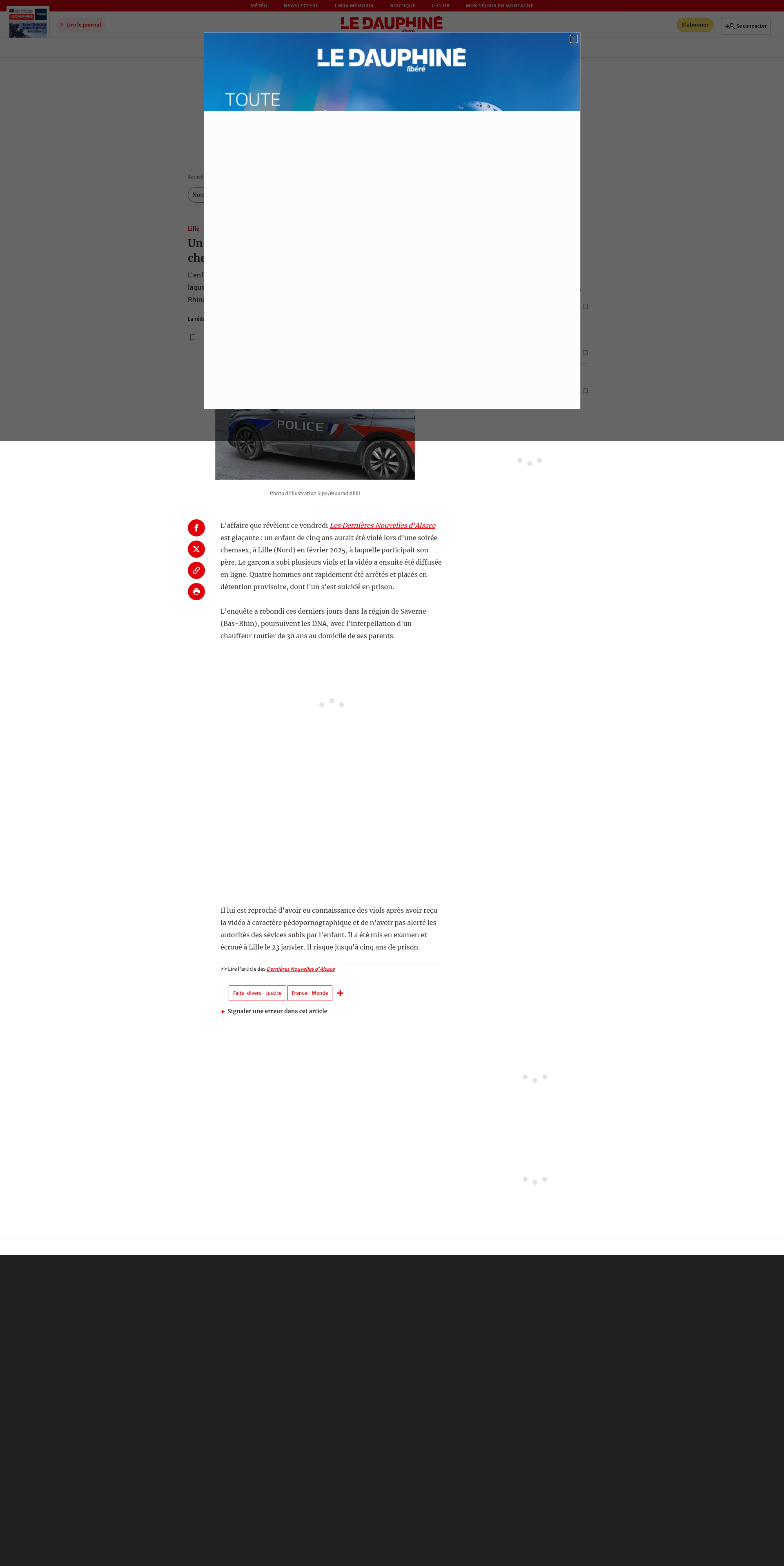 Lille. Un garçon de cinq ans violé lors d'une soirée chemsex, cinq interpellationsL'enfant aurait été violé par plusieurs hommes lors d'une soirée chemsex à laquelle participait son père, révèlent Les Dernières Nouvelles d'Alsace. Un Bas-Rhinois vient d'être interpellé pour non-dénonciation.PNGPDF