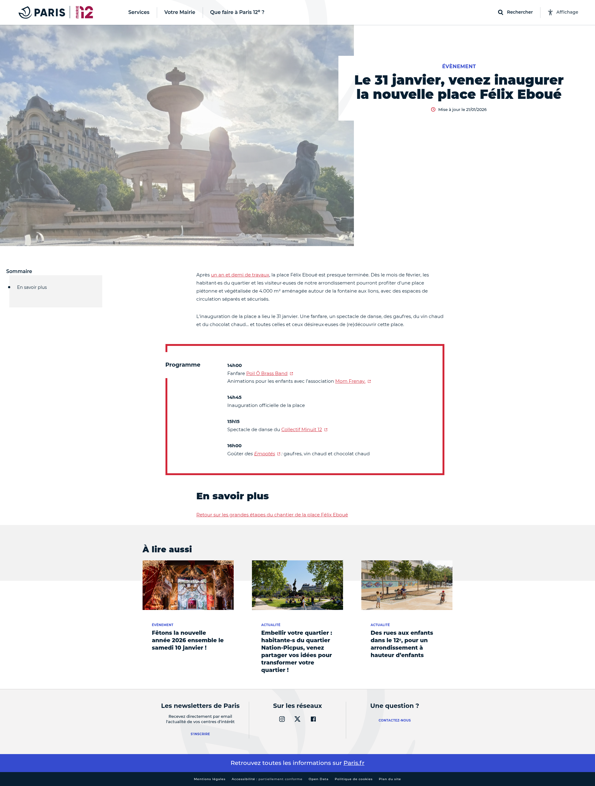 Le 31 janvier, venez inaugurer la nouvelle place Félix EbouéRetrouvez tous les services et démarches, les infos pratiques, les actualités et événements de la Ville de Paris, dans le 12ᵉ arrondissement.PNGPDF