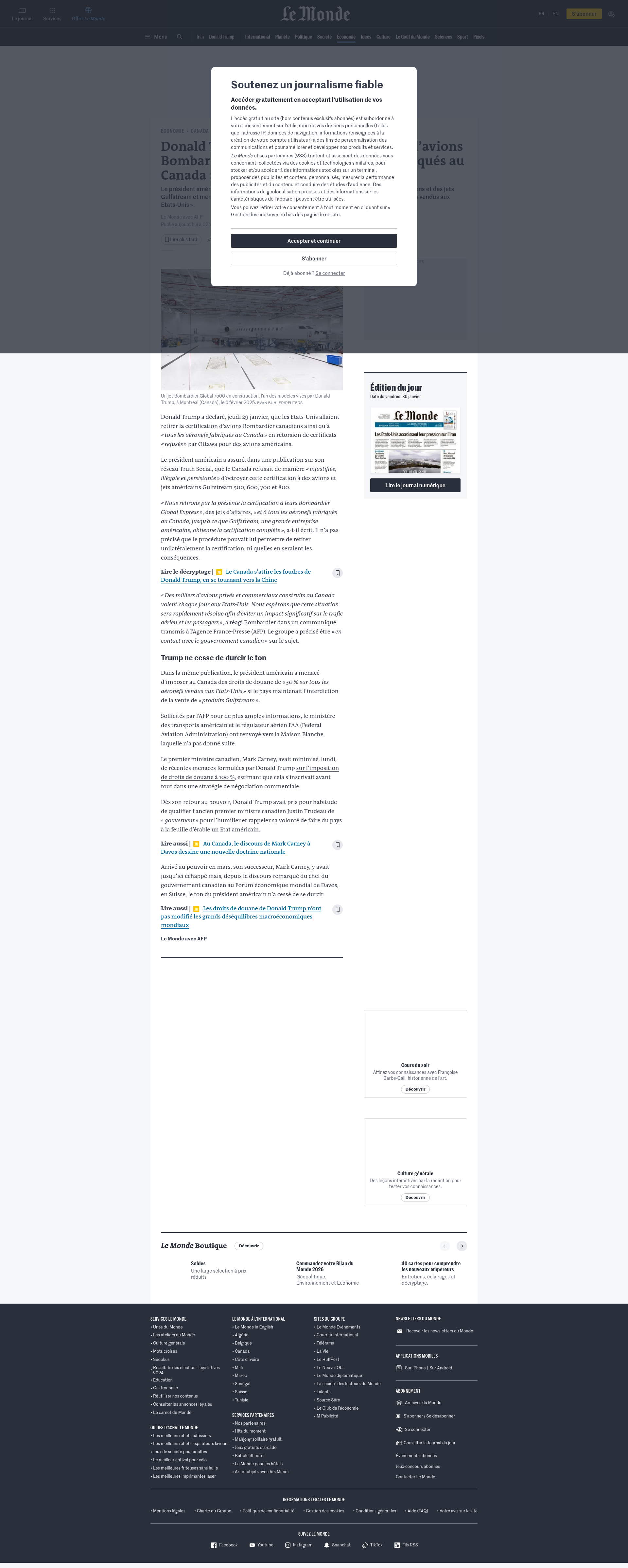 Donald Trump dit retirer la certification d’avions Bombardier et de « tous les aéronefs fabriqués au Canada »Le président américain affirme riposter au refus du Canada d’octroyer la certification à des avions et des jets Gulfstream et menace d’imposer à Ottawa des droits de douane de « 50 % sur tous les aéronefs vendus aux Etats-Unis ».PNGPDF