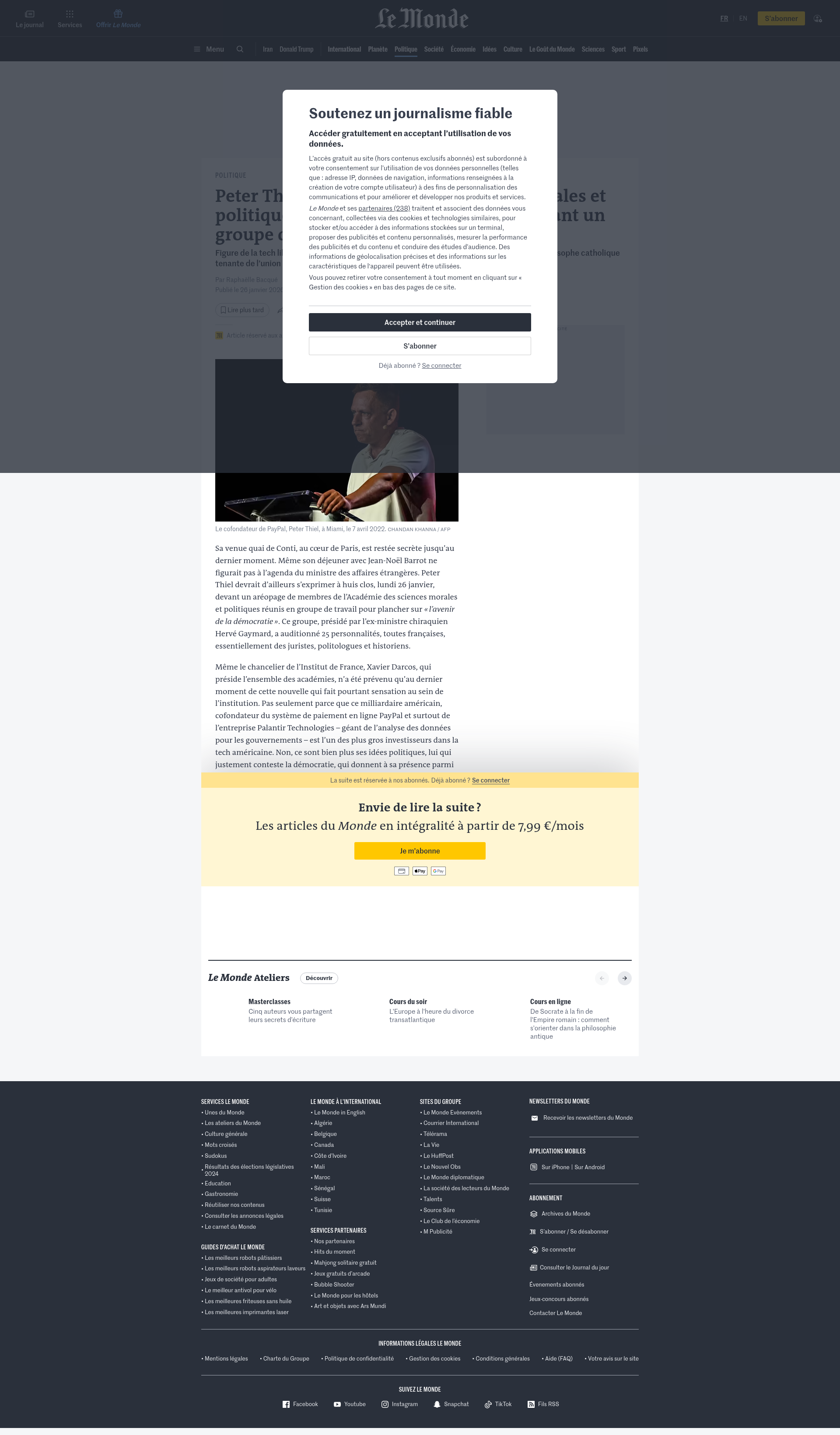 Peter Thiel à l’Académie des sciences morales et politiques pour parler de l’Antéchrist devant un groupe de travail sur la démocratieFigure de la tech libertarienne, le cofondateur de PayPal, a été convié par Chantal Delsol, philosophe catholique tenante de l’union de la droite et de l’extrême droite, à intervenir lundi 26 janvier.PNGPDF