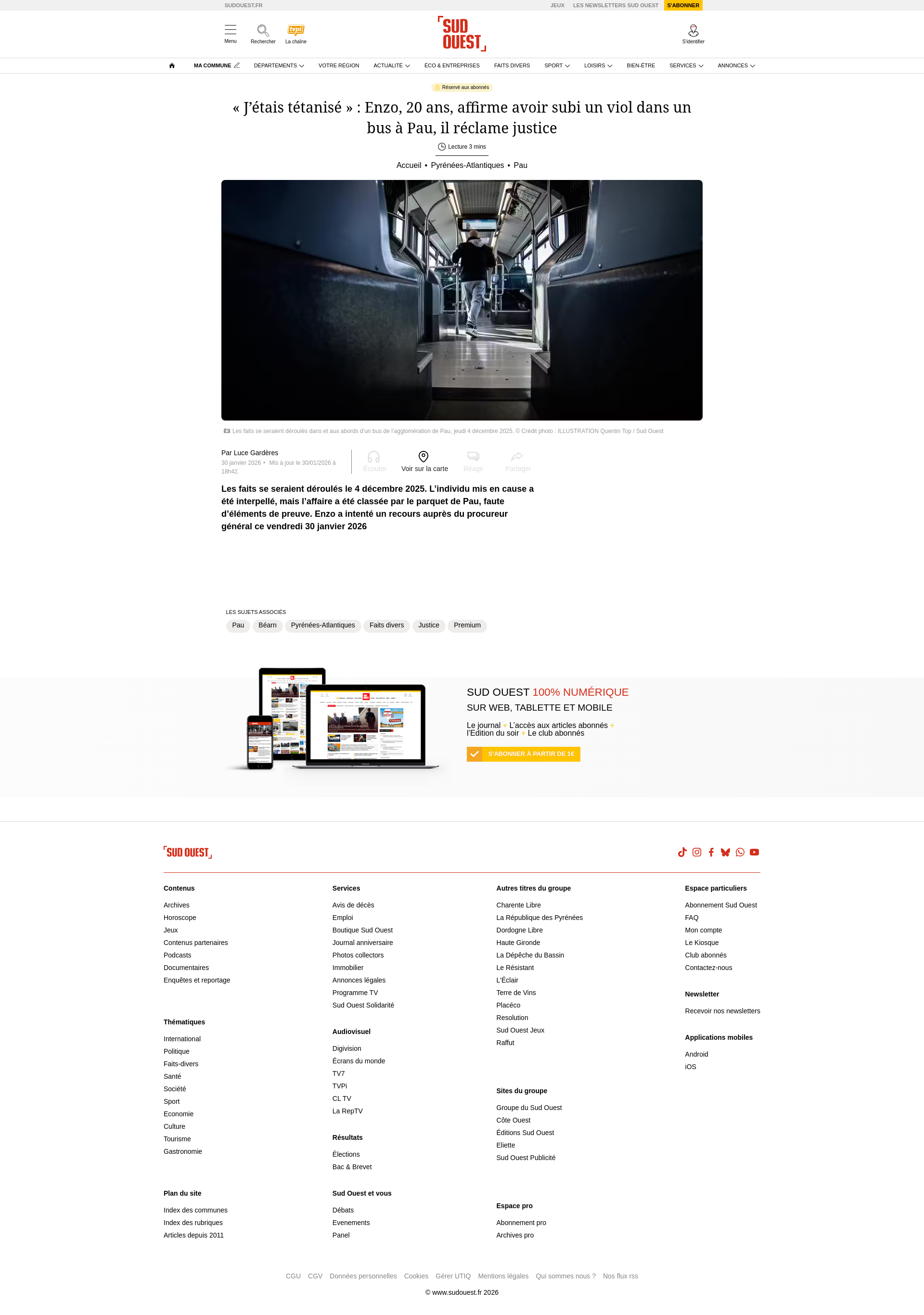 « J’étais tétanisé » : Enzo, 20 ans, affirme avoir subi un viol dans un bus à Pau, il réclame justiceLes faits se seraient déroulés le 4 décembre 2025. L’individu mis en cause a été interpellé, mais l’affaire a été classée par le parquet de Pau, faute d’éléments de preuve. Enzo a intenté un recours auprès du procureur général ce vendredi 30 janvier 2026PNGPDF