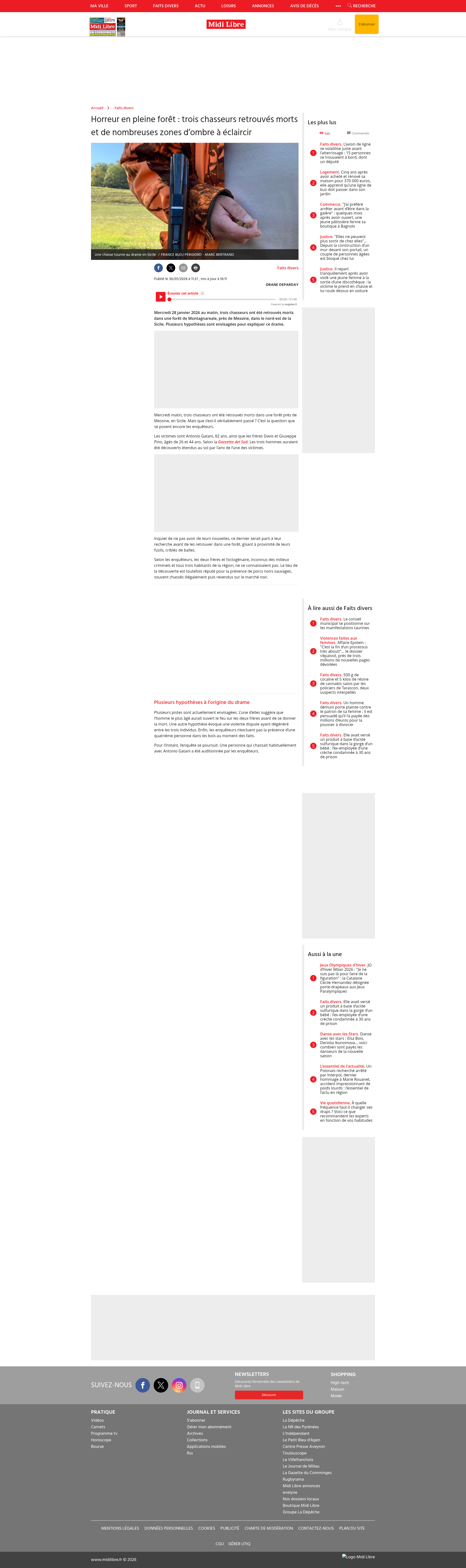 Horreur en pleine forêt : trois chasseurs retrouvés morts et de nombreuses zones d’ombre à éclaircirMercredi 28 janvier 2026 au matin, trois chasseurs ont été retrouvés morts dans une forêt de Montagnareale, près de Messine, dans le nord-est de la Sicile. Plusieurs hypothèses sont envisagées pour expliquer ce drame.PNGPDF