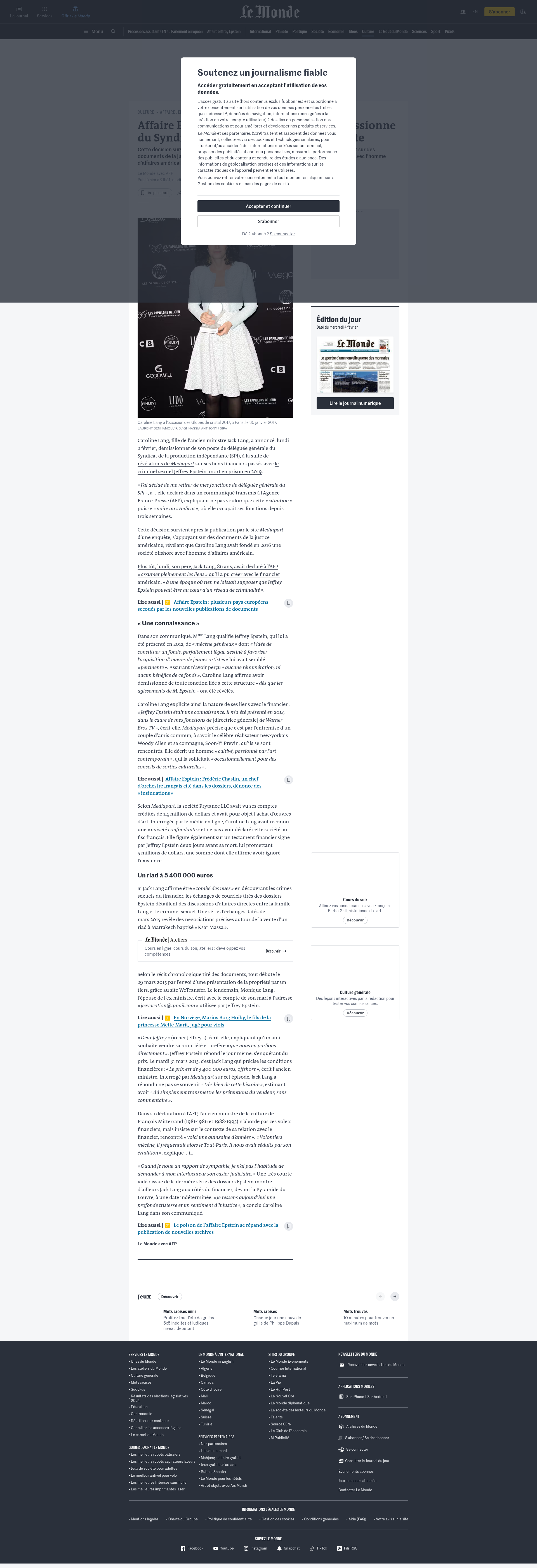 Caroline Lang, la fille de Jack Lang dont le nom apparaît dans l’affaire Epstein, démissionne du Syndicat de la production indépendanteCette décision survient après la publication par le site « Mediapart » d’une enquête, s’appuyant sur des documents de la justice américaine, révélant qu’elle avait fondé en 2016 une société offshore avec l’homme d’affaires américain.PNGPDF