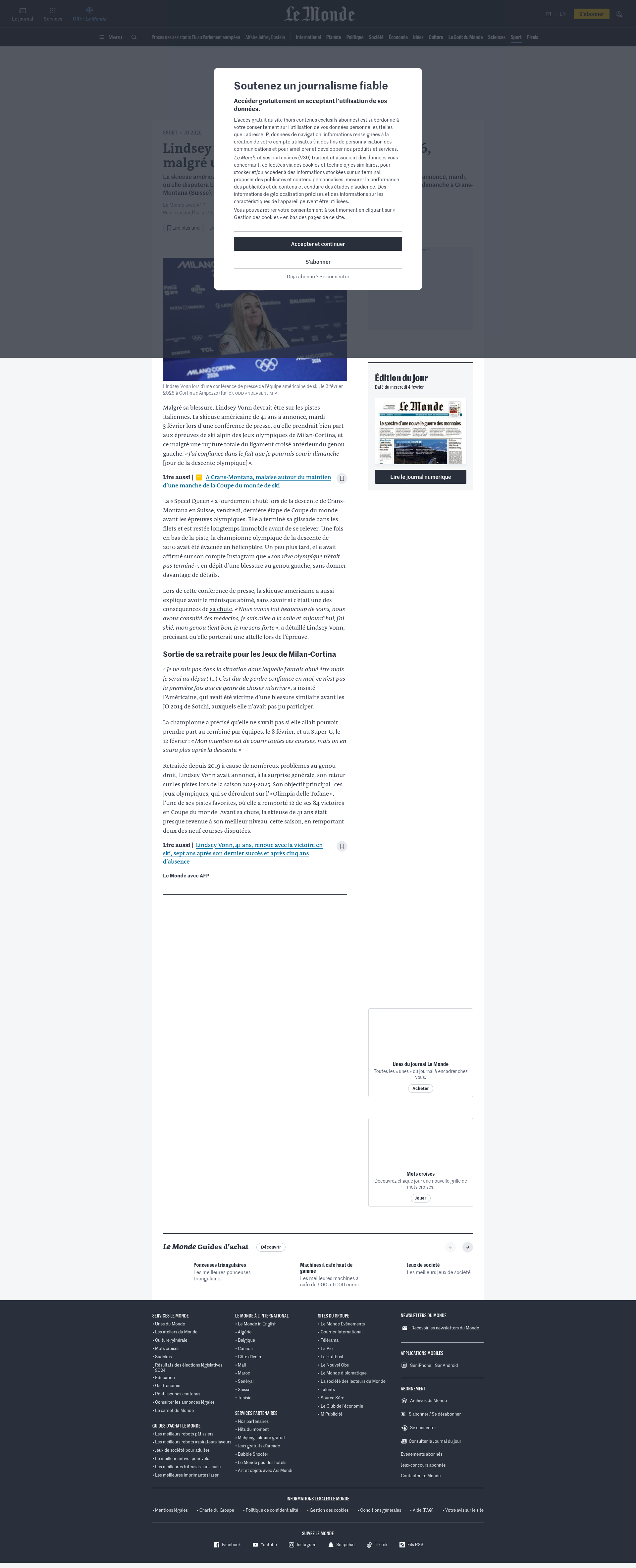 Lindsey Vonn participera bien aux JO 2026, malgré une grave blessure au genouLa skieuse américaine de 41 ans, sortie de sa retraite pour poursuivre son « rêve olympique », a annoncé, mardi, qu’elle disputera bien la descente des JO de Milan-Cortina, en dépit d’une blessure contractée dimanche à Crans-Montana (Suisse).PNGPDF
