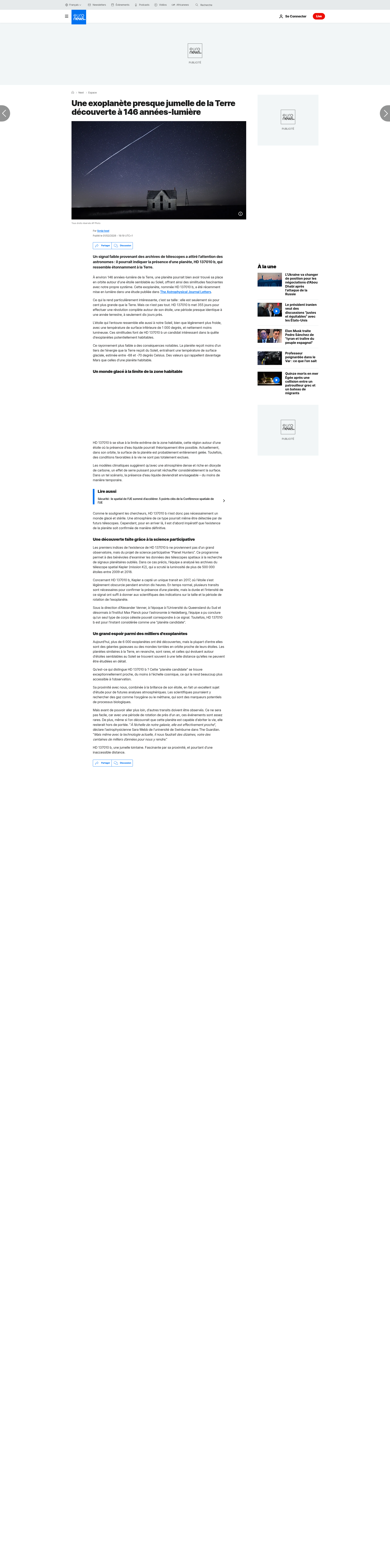 Une exoplanète presque jumelle de la Terre découverte à 146 années-lumièreUn signal faible provenant des archives de télescopes a attiré l'attention des astronomes : il pourrait indiquer la présence d'une planète, HD 137010 b, qui ressemble étonnamment à la Terre.PNGPDF