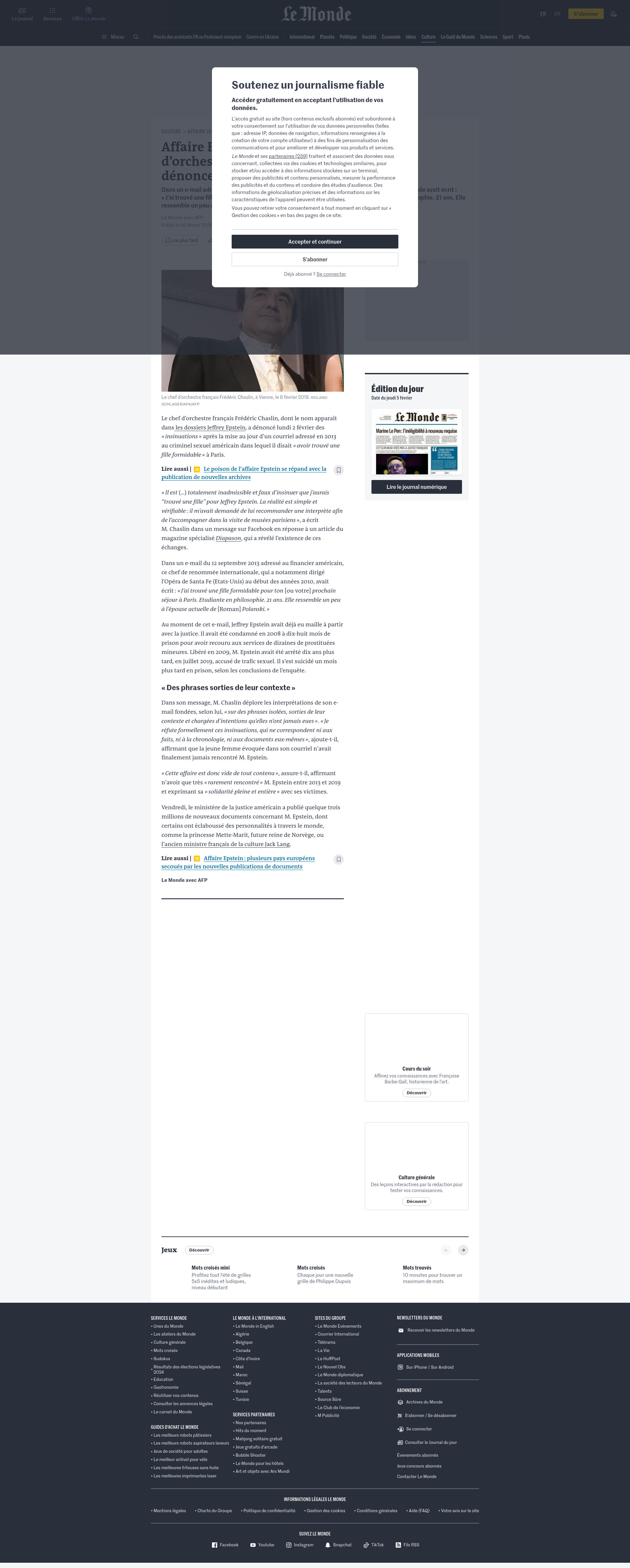 Affaire Esptein : Frédéric Chaslin, un chef d’orchestre français cité dans les dossiers, dénonce des « insinuations »Dans un e-mail adressé en 2013 à Jeffrey Epstein, le chef d’orchestre de renommée internationale avait écrit : « J’ai trouvé une fille formidable pour ton [ou votre] prochain séjour à Paris. Etudiante en philosophie. 21 ans. Elle ressemble un peu à l’épouse actuelle de [Roman] Polanski. »PNGPDF