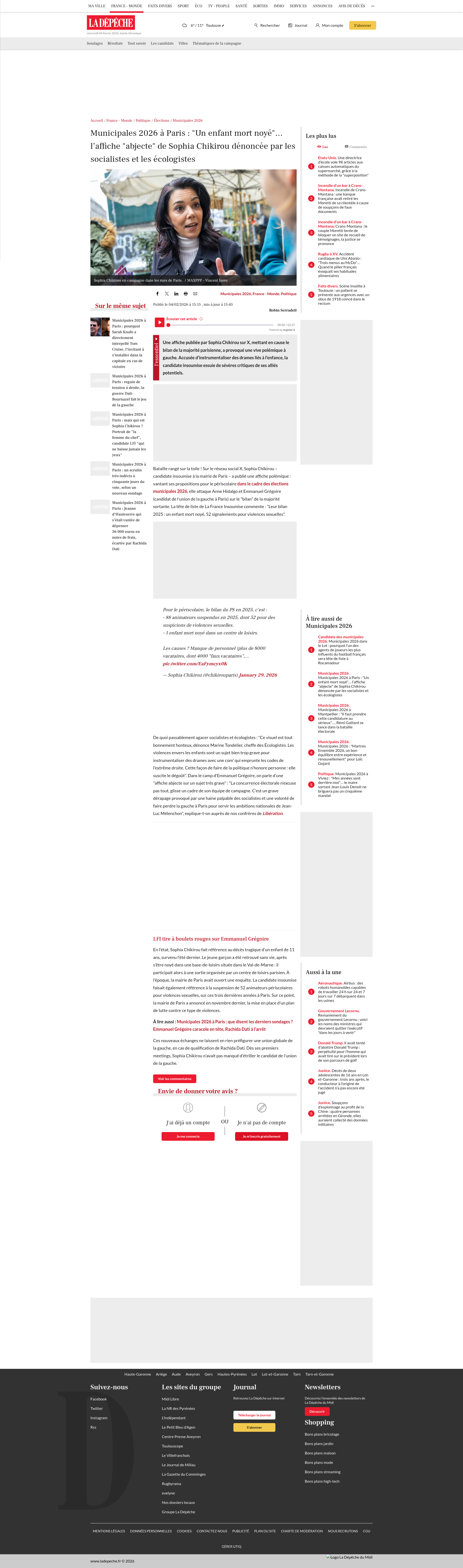 Municipales 2026 à Paris : "Un enfant mort noyé"… l’affiche "abjecte" de Sophia Chikirou dénoncée par les socialistes et les écologistesUne affiche publiée par Sophia Chikirou sur X, mettant en cause le bilan de la majorité parisienne, a provoqué une vive polémique à gauche. Accusée d’instrumentaliser des drames liés à l’enfance, la candidate...PNGPDF