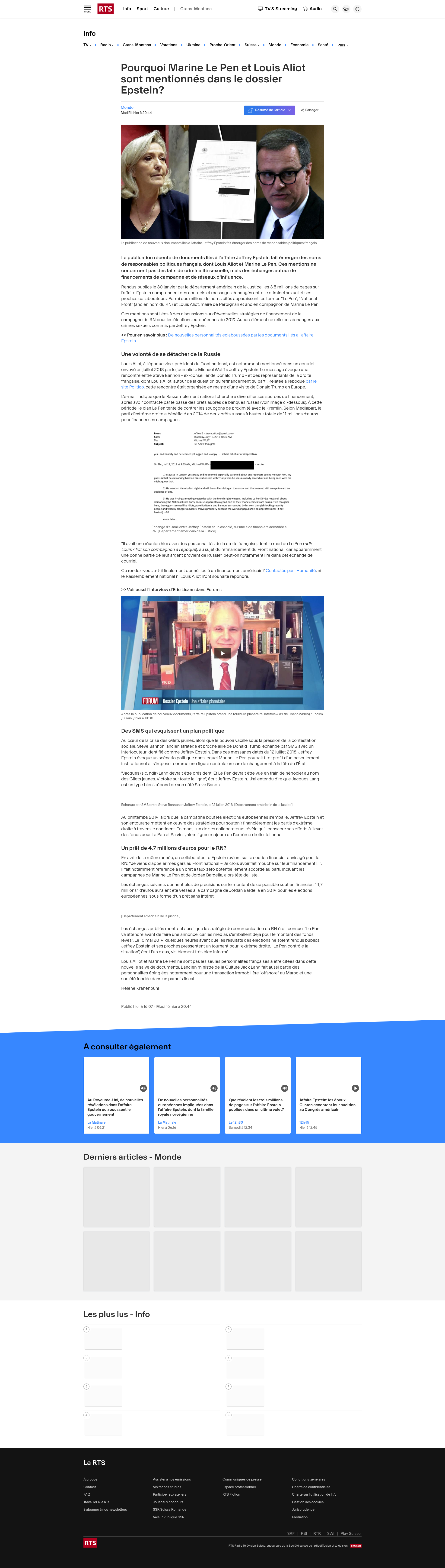 Pourquoi Marine Le Pen et Louis Aliot sont mentionnés dans le dossier Epstein? | RTSLa publication récente de documents liés à l'affaire Jeffrey Epstein fait émerger des noms de responsables politiques français, dont Louis Aliot et Marine Le Pen. Ces mentions ne concernent pas des faits de criminalité sexuelle, mais des échanges autour de financements de campagne et de réseaux d'influence.PNGPDF