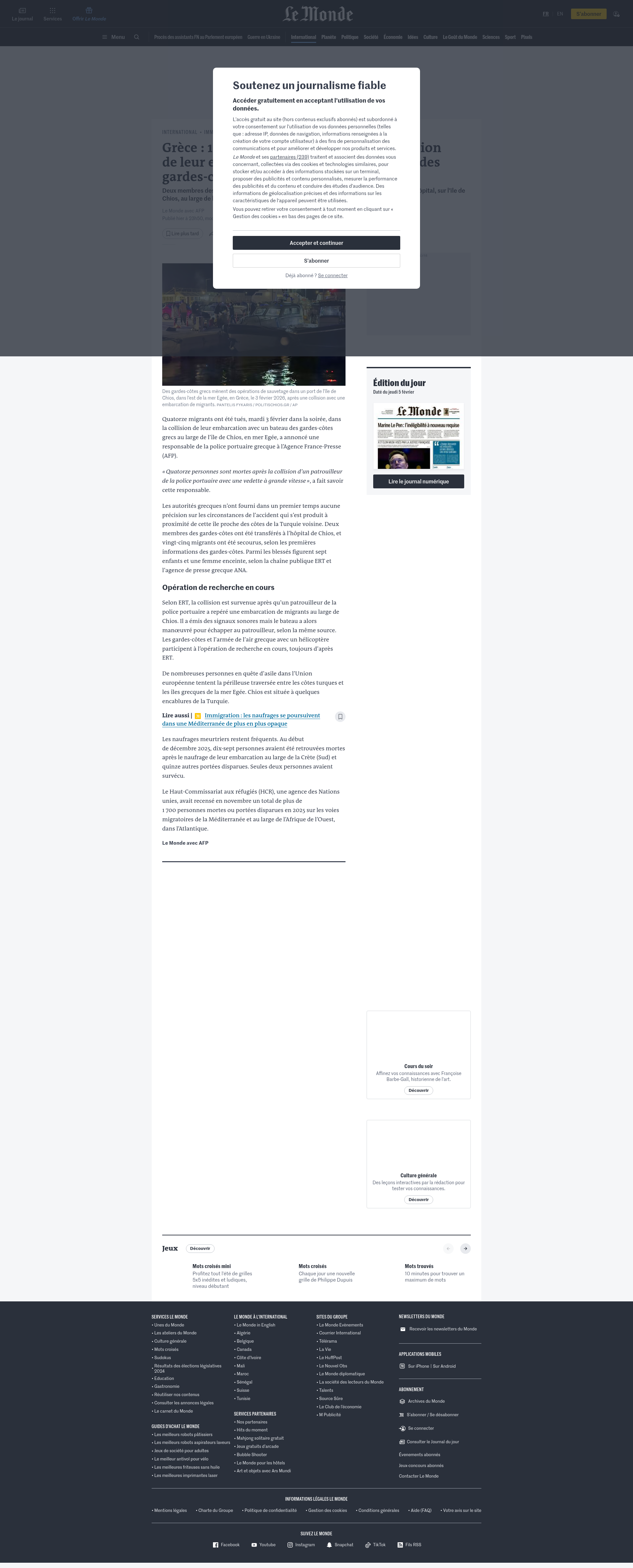 Grèce : 14 migrants meurent dans la collision de leur embarcation avec un patrouilleur des gardes-côtes en mer EgéeDeux membres des gardes-côtes grecs et vingt-cinq migrants secourus ont été transférés à l’hôpital, sur l’île de Chios, au large de laquelle s’est produit l’accident.PNGPDF