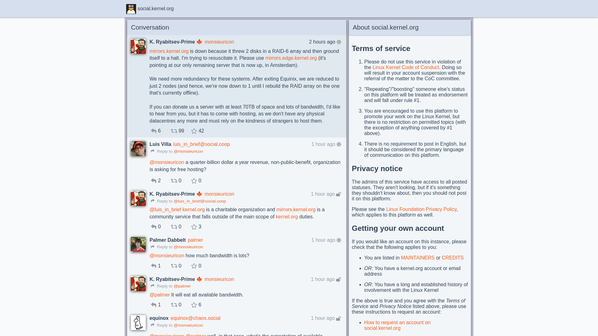 K. Ryabitsev-Prime 🍁 (@monsieuricon@social.kernel.org)mirrors.kernel.org is down because it threw 2 disks in a RAID-6 array and then ground itself to a halt. I'm trying to resuscitate it. Please use mirrors.edge.kernel.org (it's pointing at our only r...PNGPDF