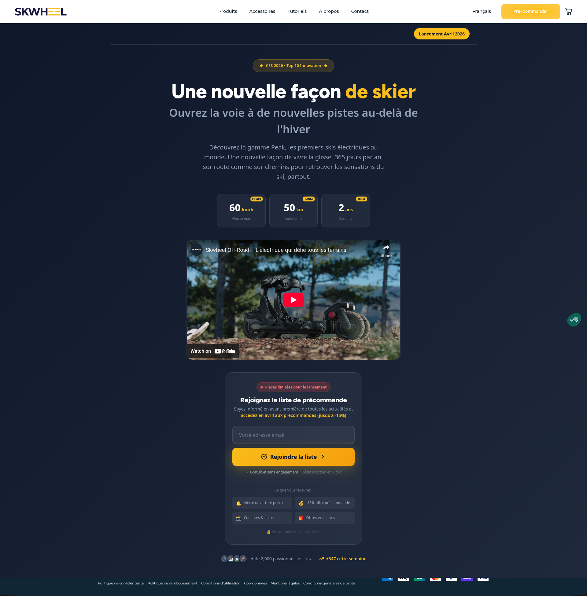 Rejoindre la liste des pré-commandes - Gamme PeakDécouvrez Skwheel et révolutionnez le monde du ski en vous offrant liberté et une expérience de glisse unique, sur tous les terrains et en toutes saisons.PNGPDF