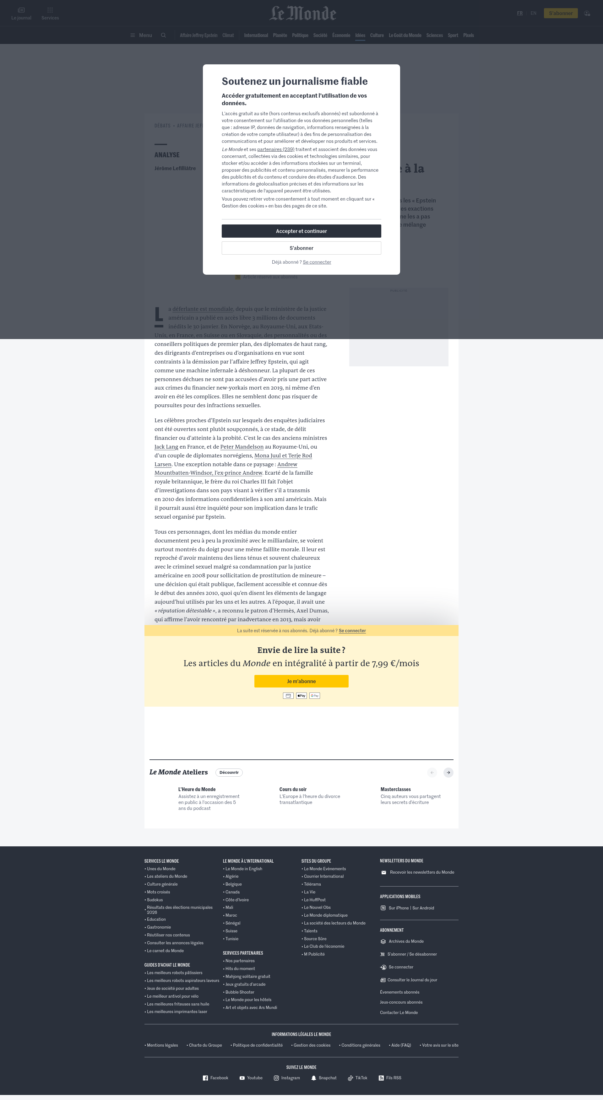 Affaire Epstein : derrière les complaisances, l’indifférence à la délinquance sexuelleANALYSE. Si la plupart des personnalités internationales qui figurent dans les « Epstein Files » ne sont pas à ce stade soupçonnées de complicité dans les exactions sexuelles du millionnaire, elles ne pouvaient les ignorer. Ce qui ne les a pas empêchées de profiter de son entregent et de ses largesses : ce mélange d’apathie et de cynisme questionne.PNGPDF