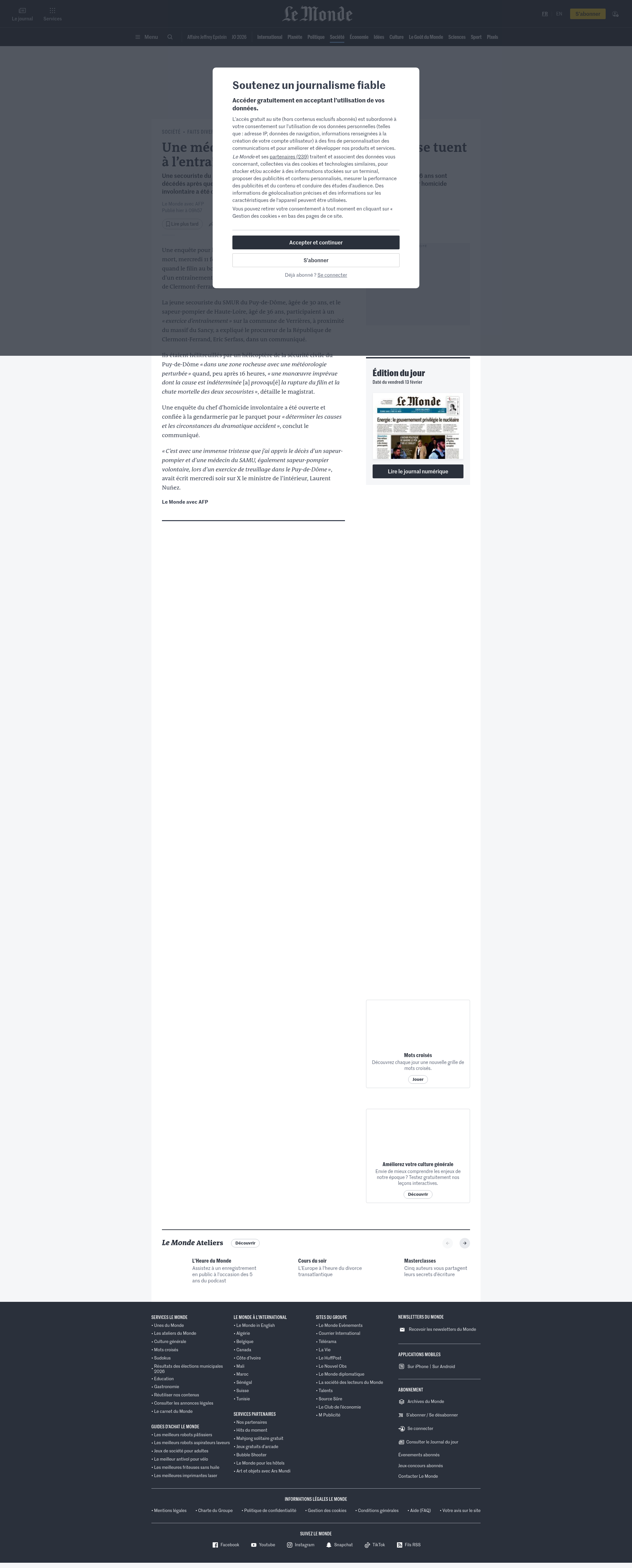 Une médecin et un pompier hélitreuillés se tuent à l’entraînement dans le Puy-de-DômeUne secouriste du SMUR du Puy-de-Dôme de 30 ans et un sapeur-pompier de Haute-Loire de 36 ans sont décédés après que le filin au bout duquel ils étaient hélitreuillés s’est rompu. Une enquête pour homicide involontaire a été ouverte.PNGPDF