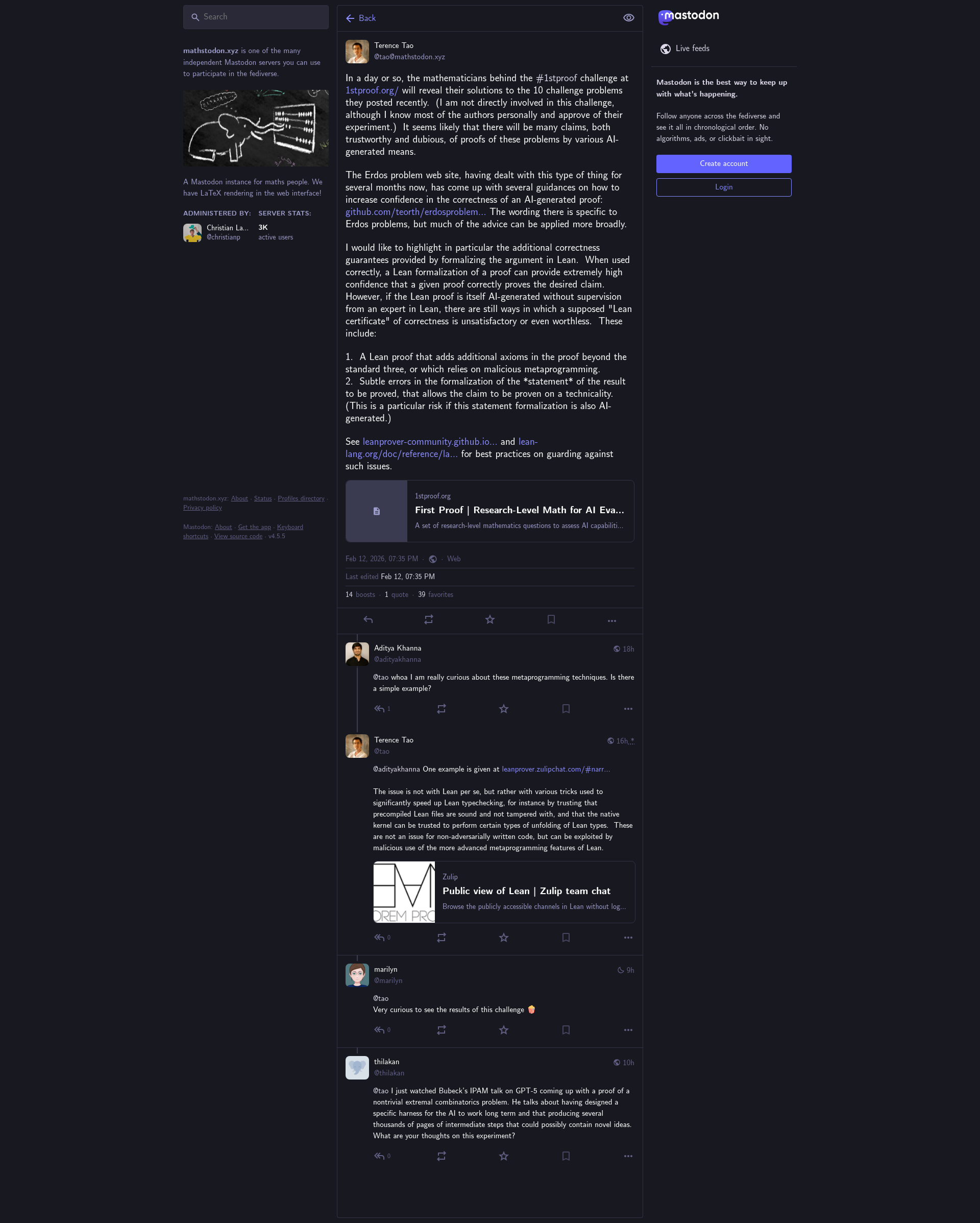Terence Tao (@tao@mathstodon.xyz)In a day or so, the mathematicians behind the #1stproof challenge at https://1stproof.org/ will reveal their solutions to the 10 challenge problems they posted recently. (I am not directly involved in this challenge, although I know most of the authors personally and approve of their experiment.) It seems likely that there will be many claims, both trustworthy and dubious, of proofs of these problems by various AI-generated means. The Erdos problem web site, having dealt with this type of thing for several months now, has come up with several guidances on how to increase confidence in the correctness of an AI-generated proof: https://github.com/teorth/erdosproblems/wiki/I-think-I-managed-to-get-my-favorite-AI-tool-to-solve-an-open-Erd%C5%91s-problem!--What-do-I-do-next%3F The wording there is specific to Erdos problems, but much of the advice can be applied more broadly. I would like to highlight in particular the additional correctness guarantees provided by formalizing the argument in Lean. When used correctly, a Lean formalization of a proof can provide extremely high confidence that a given proof correctly proves the desired claim. However, if the Lean proof is itself AI-generated without supervision from an expert in Lean, there are still ways in which a supposed "Lean certificate" of correctness is unsatisfactory or even worthless. These include: 1. A Lean proof that adds additional axioms in the proof beyond the standard three, or which relies on malicious metaprogramming. 2. Subtle errors in the formalization of the *statement* of the result to be proved, that allows the claim to be proven on a technicality. (This is a particular risk if this statement formalization is also AI-generated.) See https://leanprover-community.github.io/did_you_prove_it.html and https://lean-lang.org/doc/reference/latest/ValidatingProofs/#validating-proofs for best practices on guarding against such issues.PNGPDF