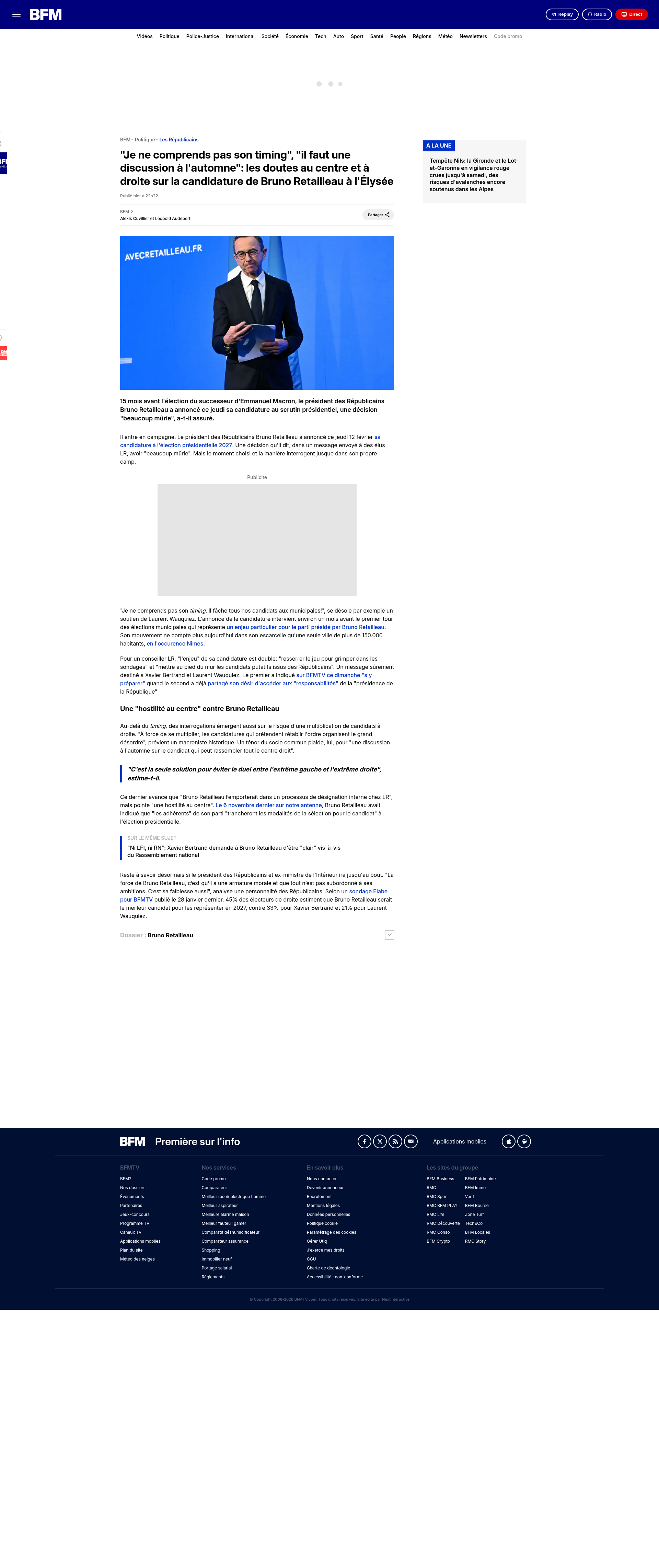 "Je ne comprends pas son timing", "il faut une discussion à l'automne": les doutes au centre et à droite sur la candidature de Bruno Retailleau à l'Élysée15 mois avant l'élection du successeur d'Emmanuel Macron, le président des Républicains Bruno Retailleau a annoncé ce jeudi sa candidature au scrutin présidentiel, une décision "beaucoup mûrie", a-t-il assuré.PNGPDF