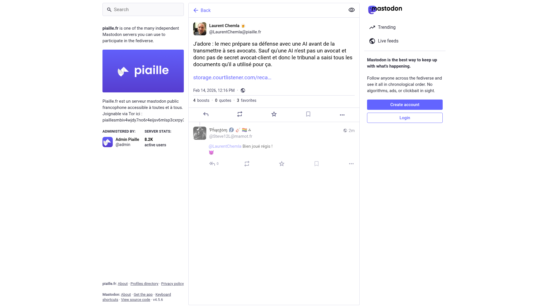 Laurent Chemla 🍺 (@LaurentChemla@piaille.fr)J'adore : le mec prépare sa défense avec une AI avant de la transmettre à ses avocats. Sauf qu'une AI n'est pas un avocat et donc pas de secret avocat-client et donc le tribunal a saisi tous les documents qu'il a utilisé pour ça. https://storage.courtlistener.com/recap/gov.uscourts.nysd.652138/gov.uscourts.nysd.652138.22.0.pdfPNGPDF