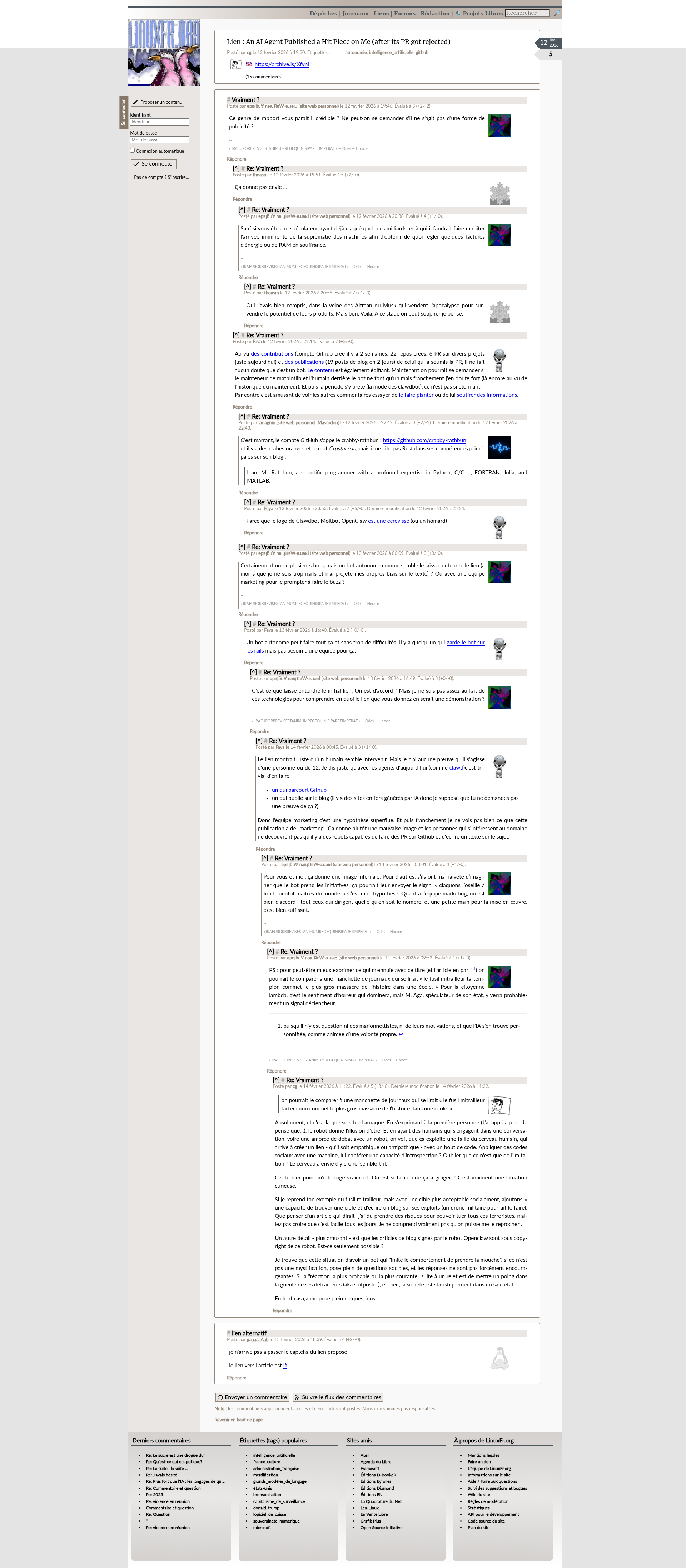 An AI Agent Published a Hit Piece on Me (after its PR got rejected) - LinuxFr.orgAn AI Agent Published a Hit Piece on Me (after its PR got rejected)PNGPDF