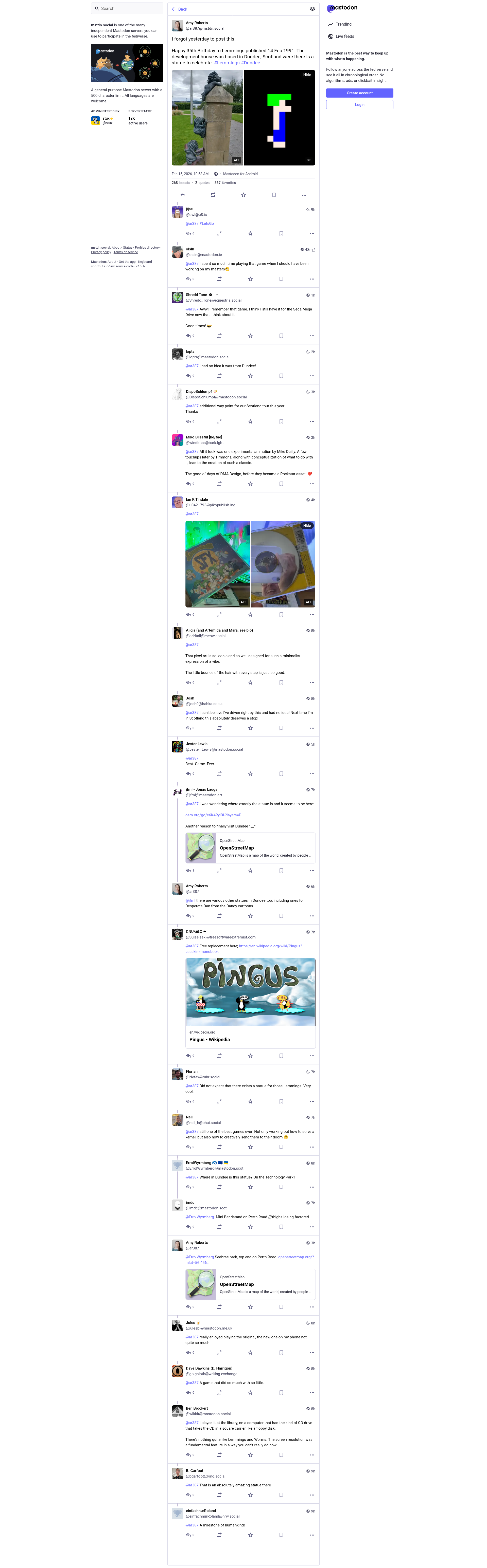 Amy Roberts (@ar387@mstdn.social)Attached: 2 images I forgot yesterday to post this. Happy 35th Birthday to Lemmings published 14 Feb 1991. The development house was based in Dundee, Scotland were there is a statue to celebrate. #Lemmings #DundeePNGPDF