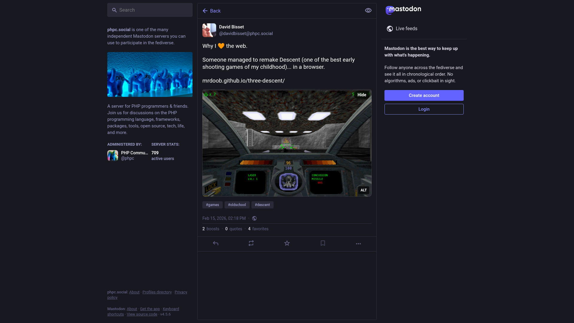 David Bisset (@davidbisset@phpc.social)Attached: 1 image Why I 🧡 the web. Someone managed to remake Descent (one of the best early shooting games of my childhood)... in a browser. mrdoob.github.io/three-descent/ #games #oldschool #descentPNGPDF