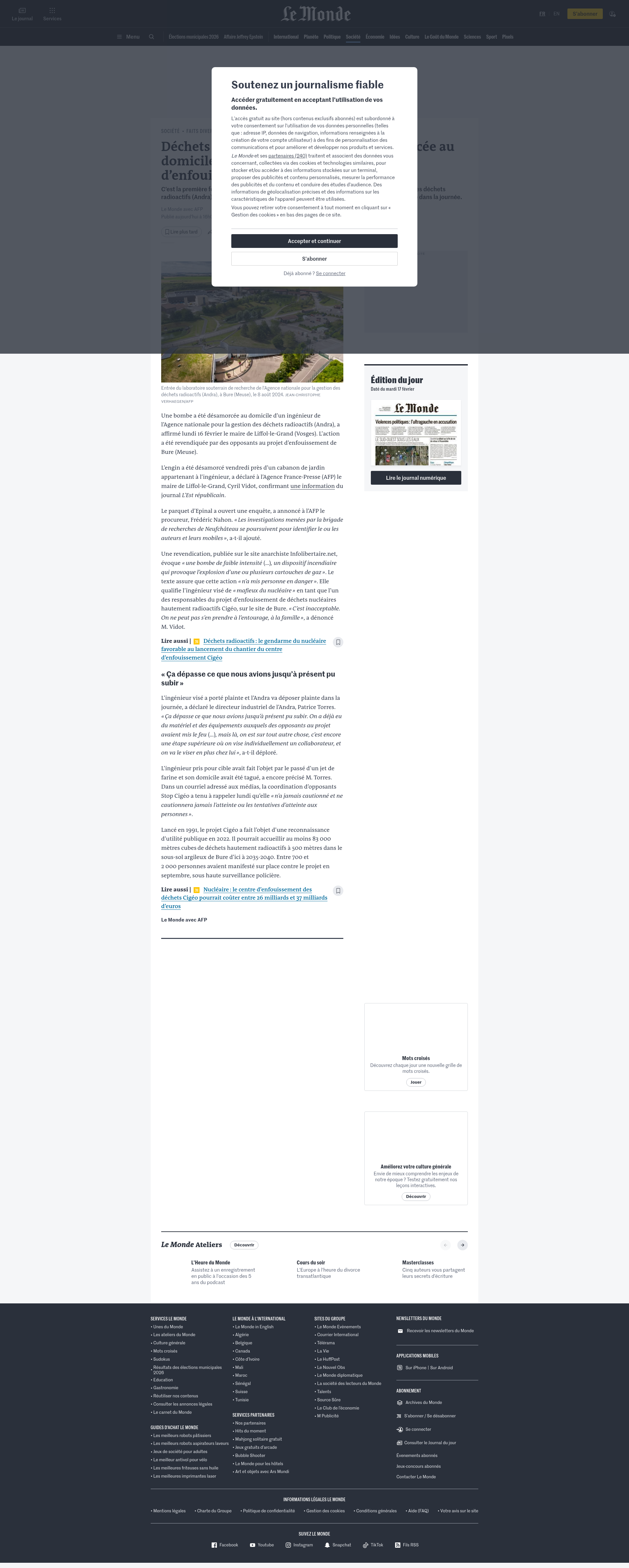 Déchets radioactifs : une bombe désamorcée au domicile d’un ingénieur du projet d’enfouissement Cigéo de BureC’est la première fois qu’une attaque vise un travailleur de l’Agence nationale pour la gestion des déchets radioactifs (Andra) à son domicile. L’ingénieur visé a porté plainte et l’Andra va déposer plainte dans la journée.PNGPDF