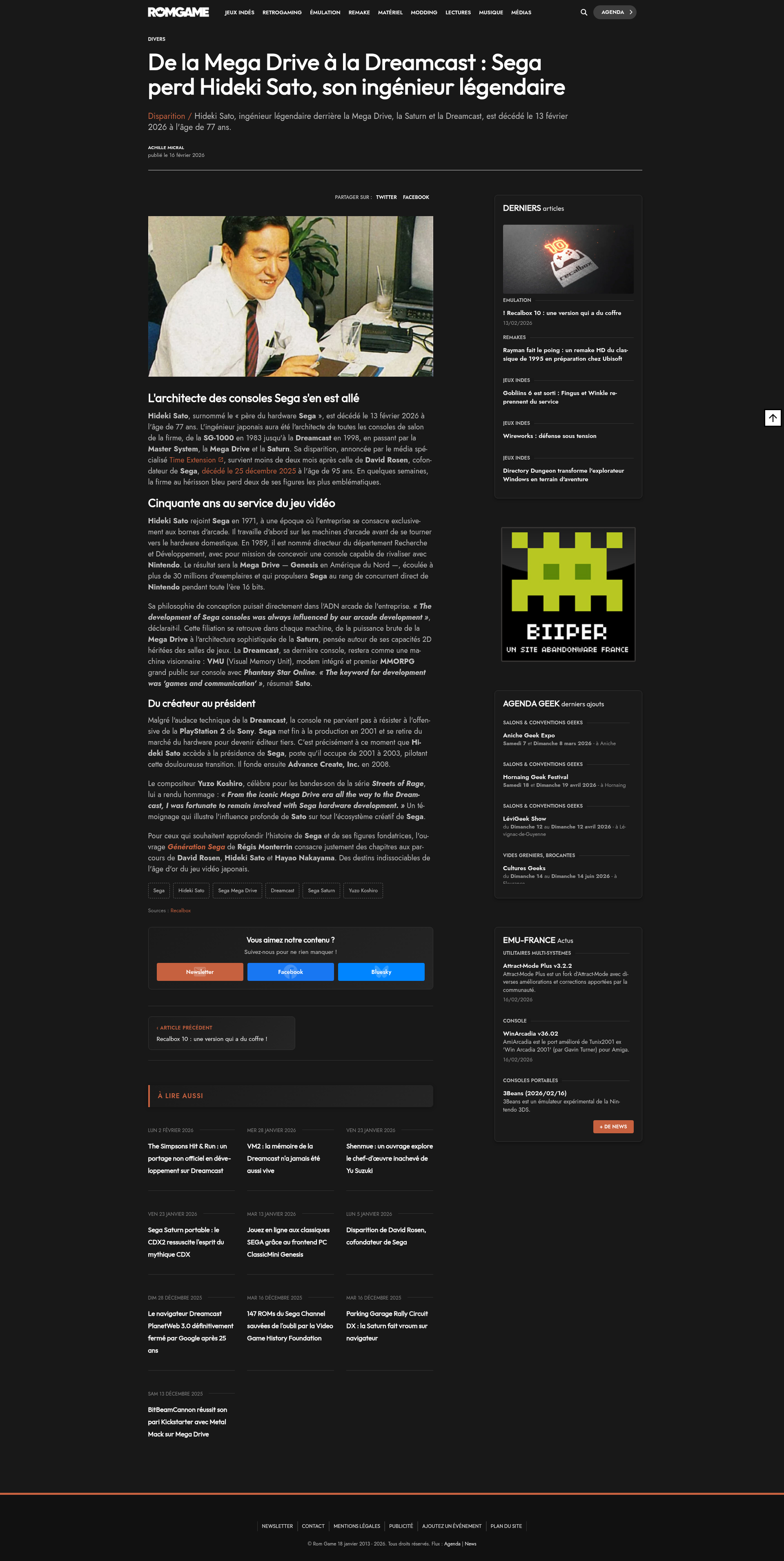 De la Mega Drive à la Dreamcast : Sega perd Hideki Sato, son ingénieur légendaireHideki Sato, ingénieur légendaire derrière la Mega Drive, la Saturn et la Dreamcast, est décédé le 13 février 2026 à l'âge de 77 ans.PNGPDF