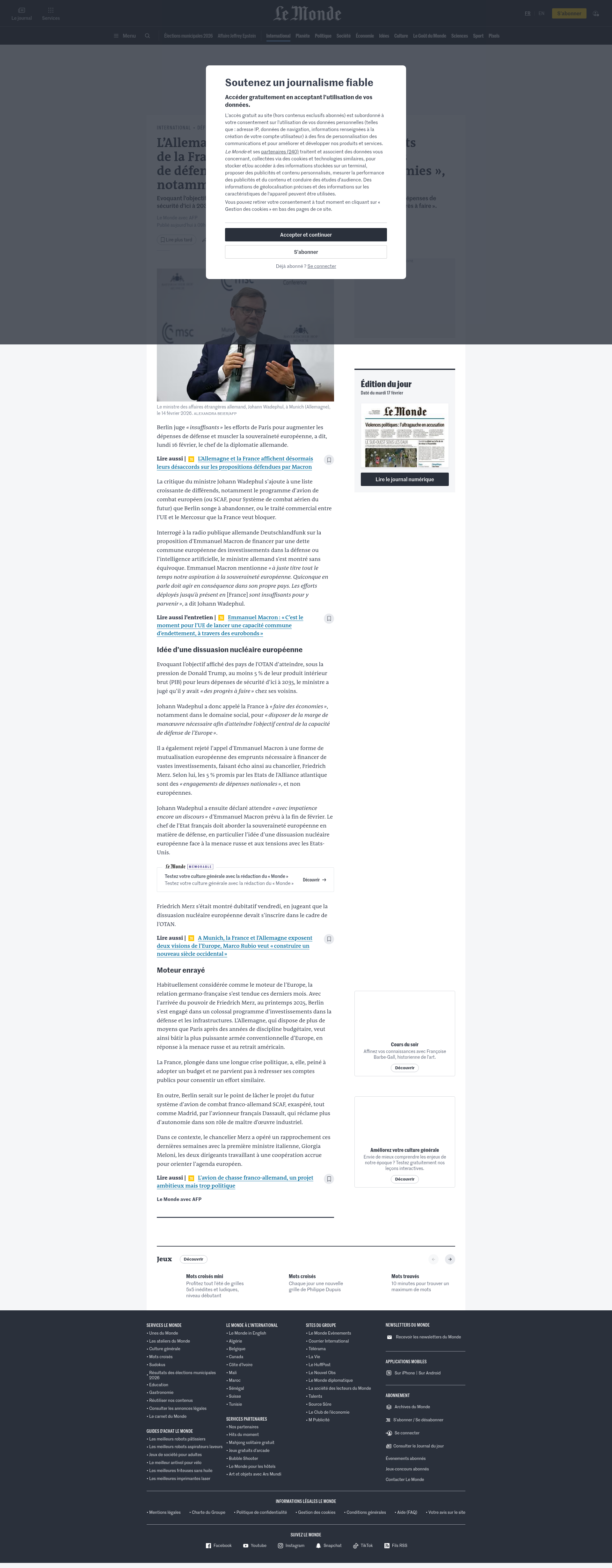 L’Allemagne juge « insuffisants » les efforts de la France pour augmenter les dépenses de défense et l’appelle à « faire des économies », notamment dans le socialEvoquant l’objectif affiché des pays de l’OTAN d’atteindre au moins 5 % de leur PIB pour leurs dépenses de sécurité d’ici à 2035, le ministre des affaires étrangères allemand a jugé qu’il y avait « des progrès à faire ».PNGPDF