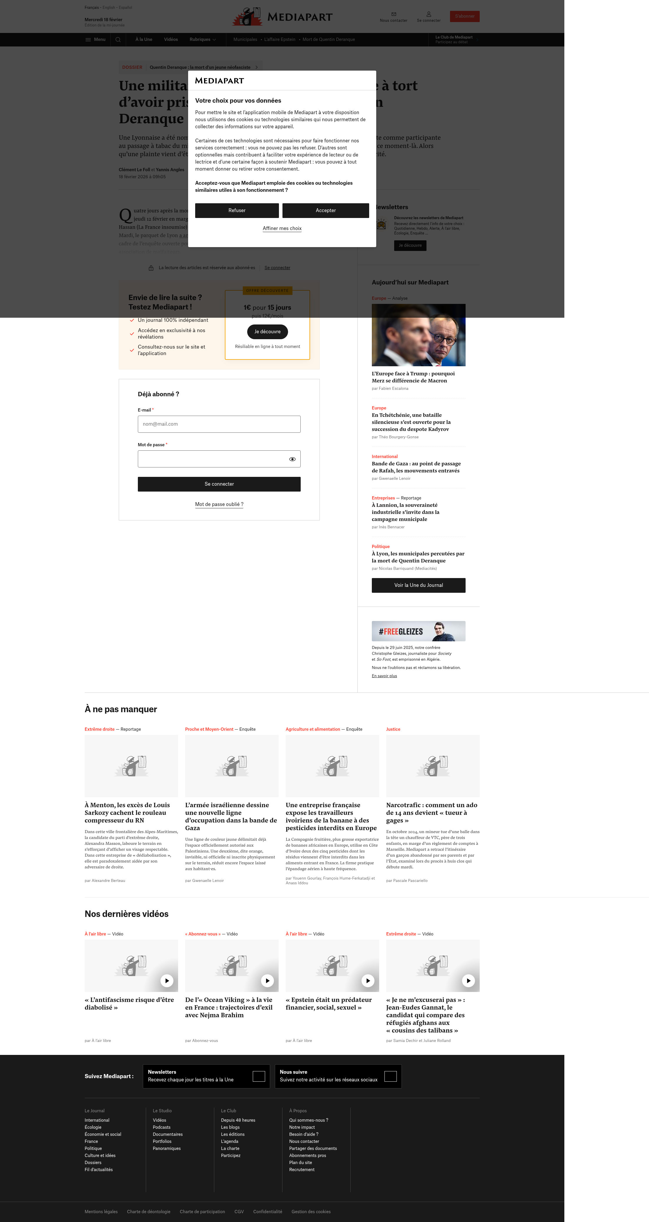 Mort de Quentin Deranque : retour sur le parcours d’un militant néofascisteLe jeune homme de 23 ans, décédé après une brutale agression à Lyon, s’était récemment rapproché de plusieurs collectifs d’extrême droite ayant recours à la violence. Passé par l’Action française, il…PNGPDF