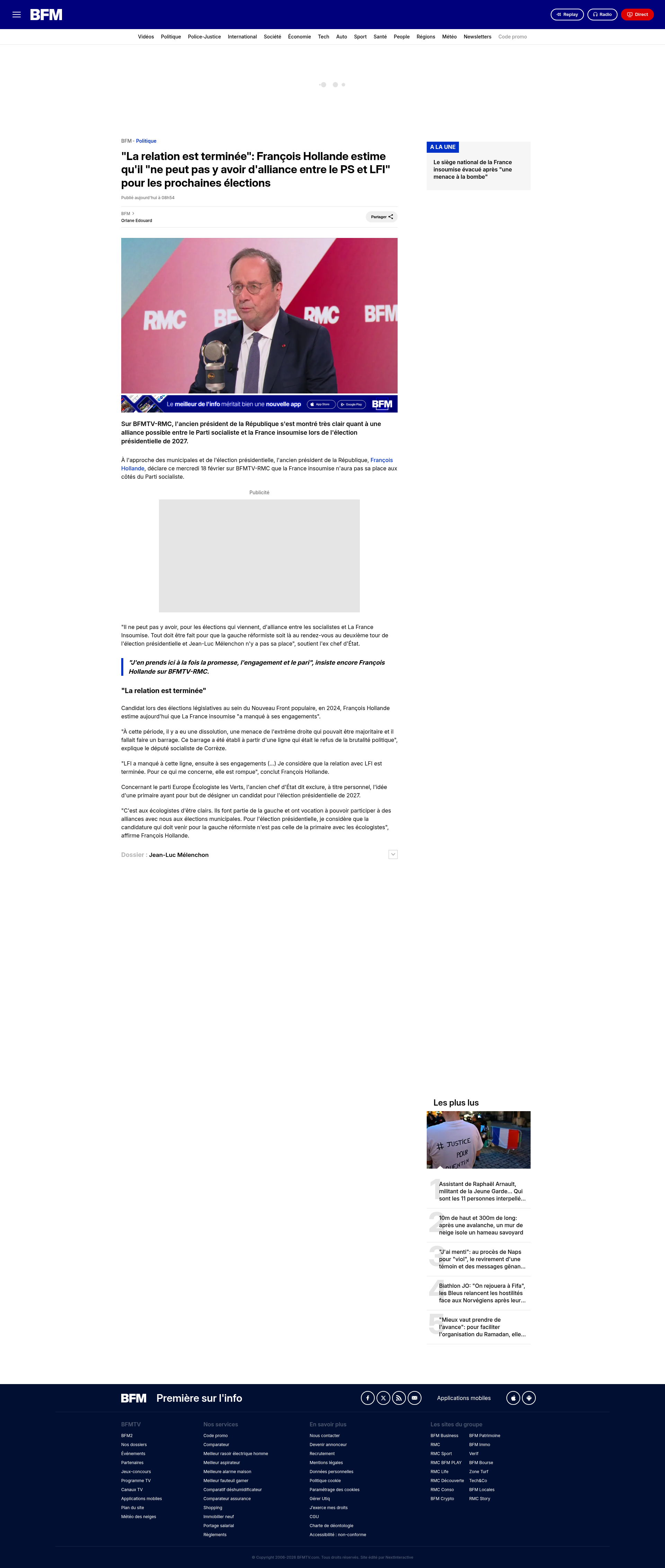 "La relation est terminée": François Hollande estime qu'il "ne peut pas y avoir d'alliance entre le PS et LFI" pour les prochaines électionsSur BFMTV-RMC, l'ancien président de la République s'est montré très clair quant à une alliance possible entre le Parti socialiste et la France insoumise lors de l'élection présidentielle de 2027. PNGPDF